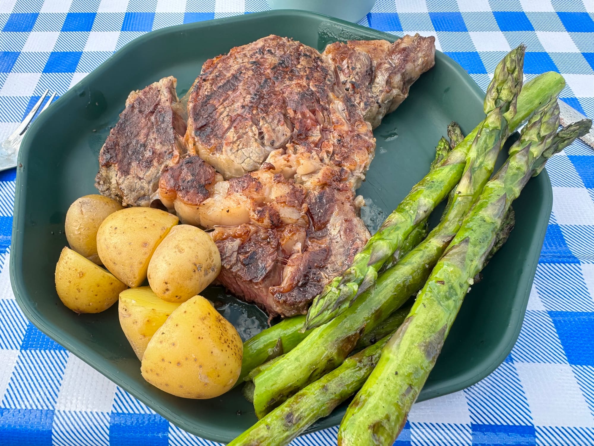 For dinner, Greg used our portable butane grill to make the Alberta Prime Ribeye steaks we bought yesterday at Granville Island, along with the asparagus we bought today in Abbotsford. We’re eating well, at least while we have these great groceries.