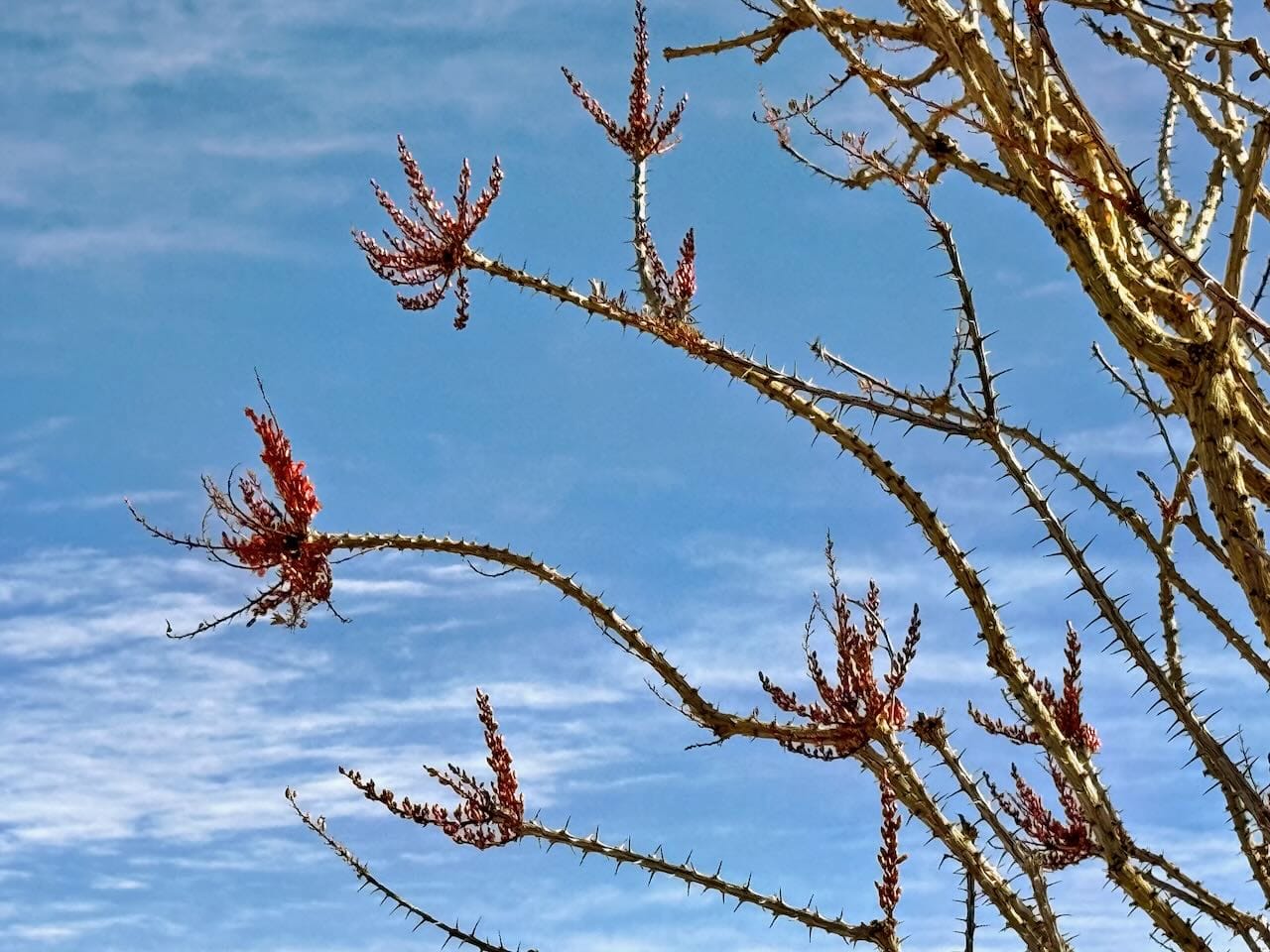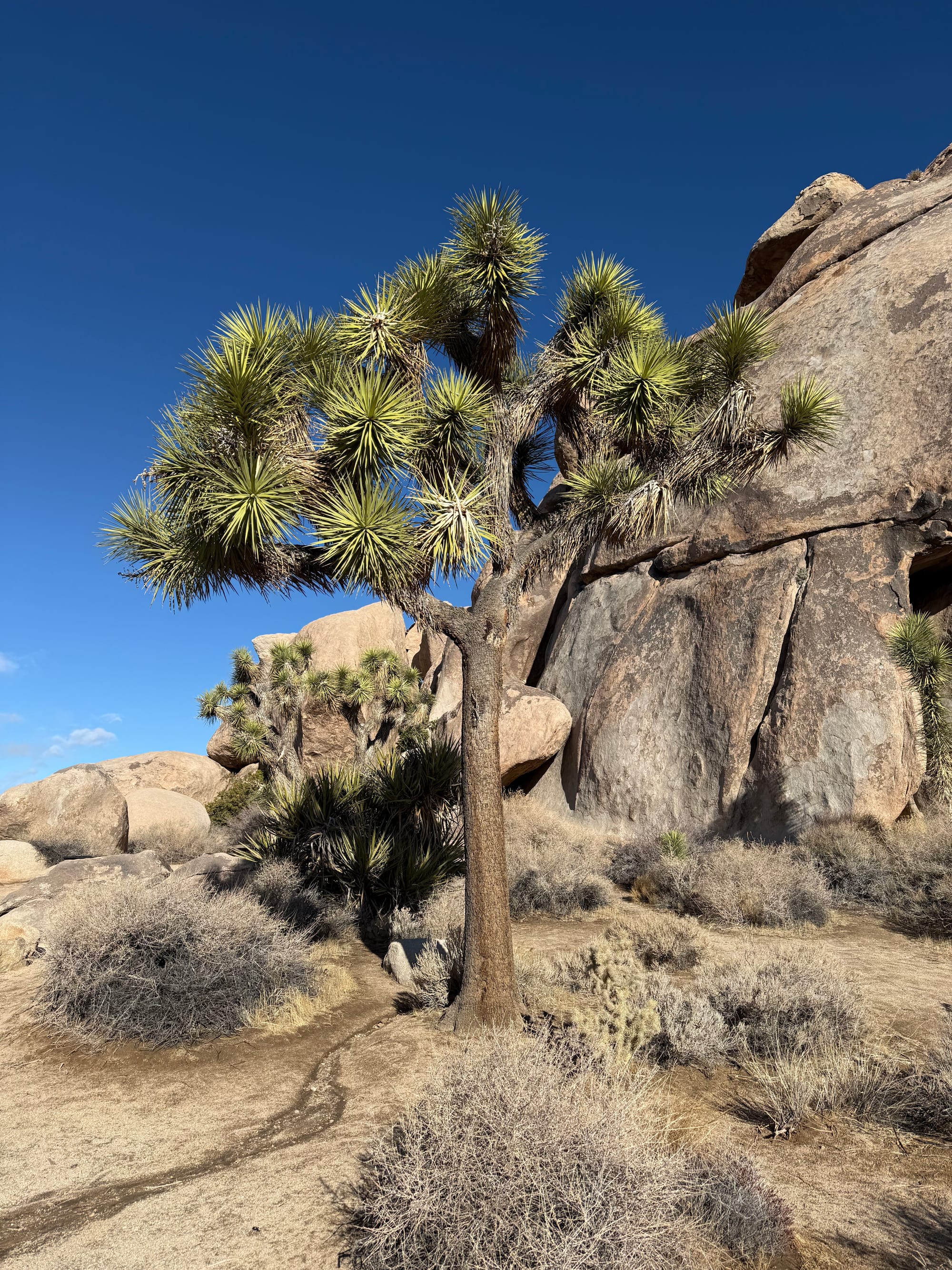 To put the rain in perspective, a ranger told us that Joshua Tree NP aspires to 5 inches of rain in a good year; we saw 20% of that rain in a single night. This gave us some views that we had not seen before, like a blooming Ocotillo, water pooling, and the rainbow in the cover photo.