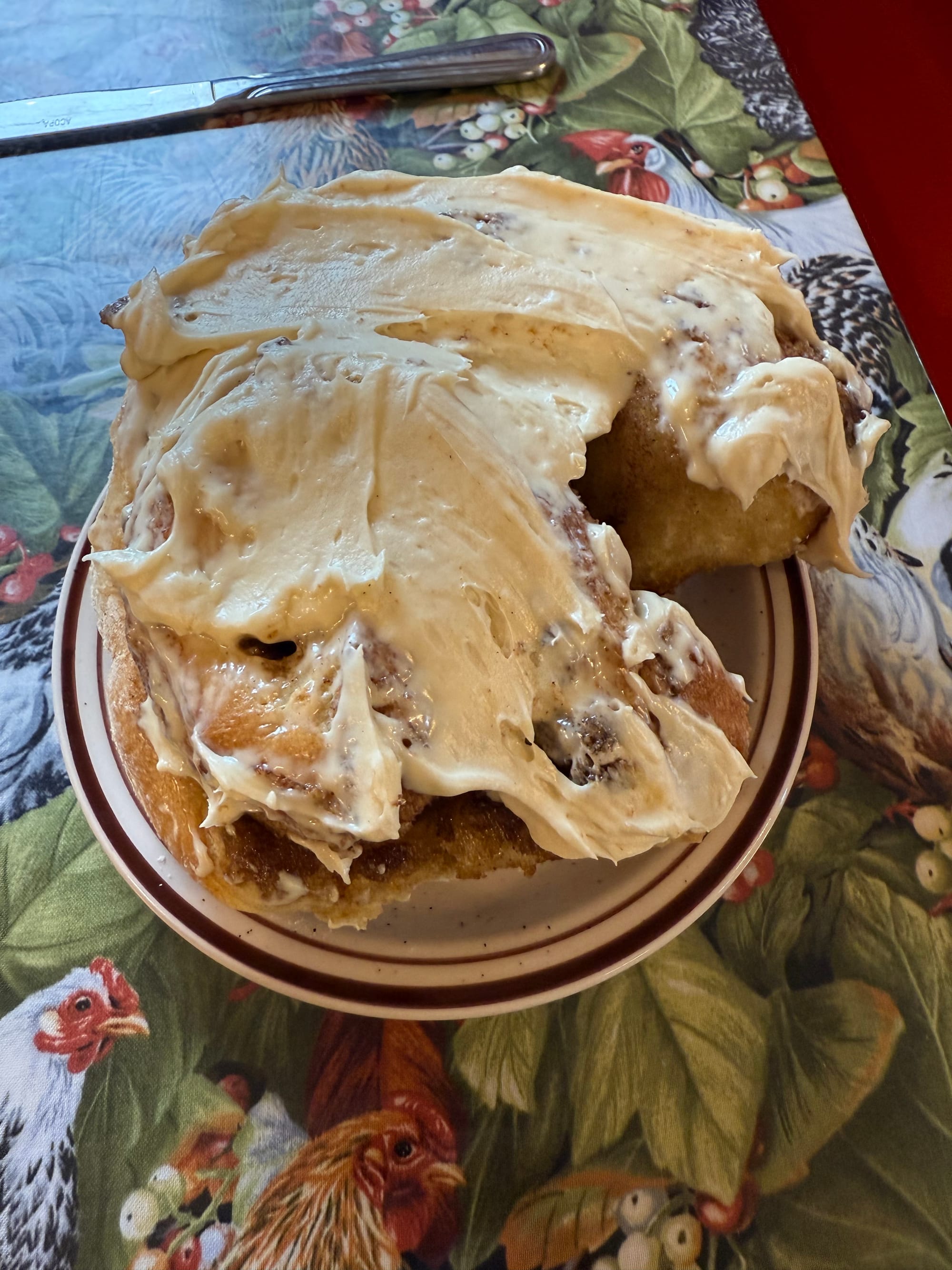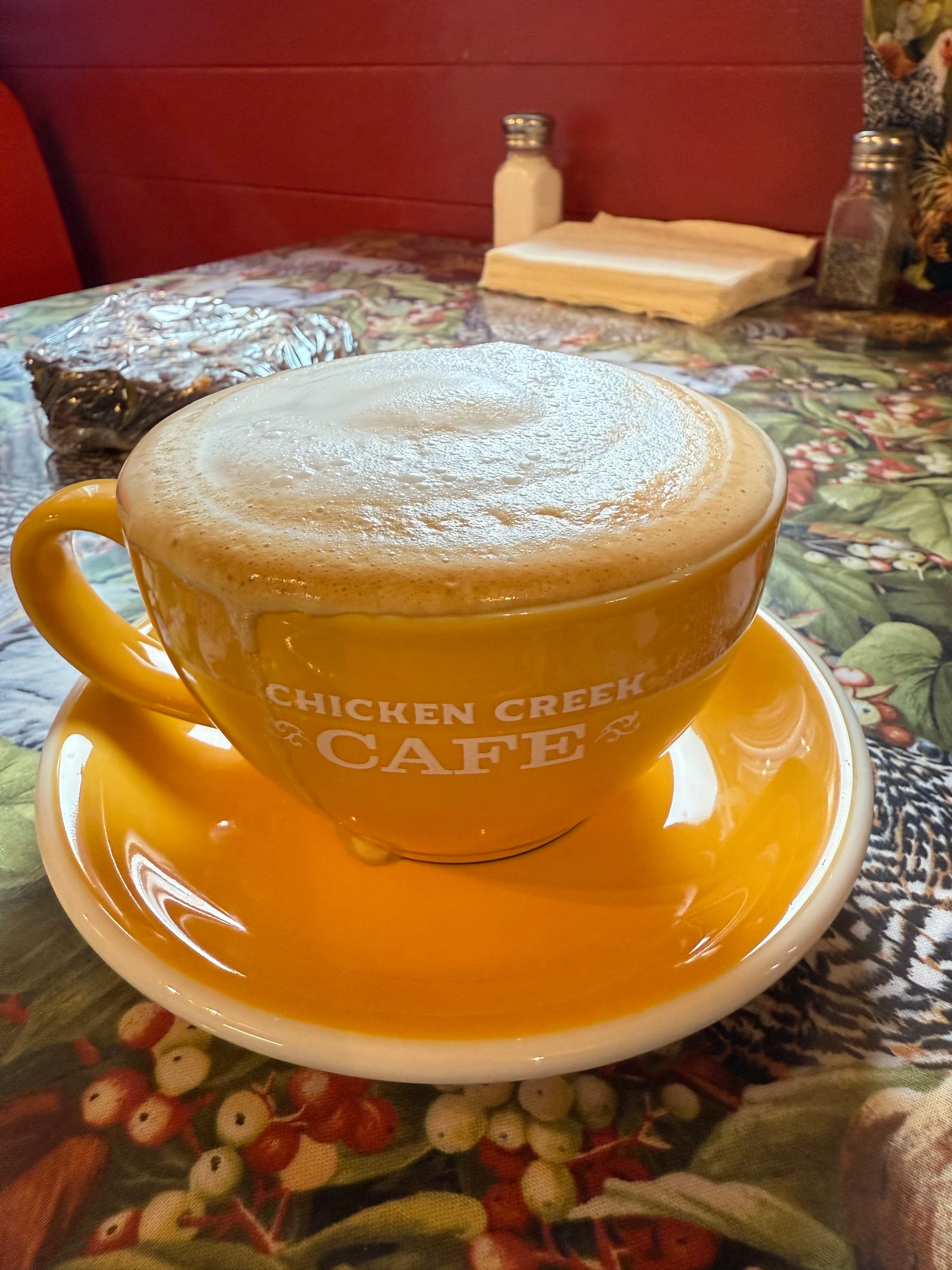 The Chicken Creek Cafe is known for its pie. Based on the description in a guidebook, Greg decided we had to stop. Amy isn’t a fan of pie, but was willing to check it out. When we walked into the cafe, the first thing we saw was a tray of cinnamon rolls. Another customer sang the praises of the cinnamon rolls, so we decided to try them. They were huge pillows of sweet deliciousness. Amy felt that these made up for the rolls we missed on the northbound drive on the Alcan highway. Greg thought they were among the best cinnamon rolls ever! The latte and tea was good, too.