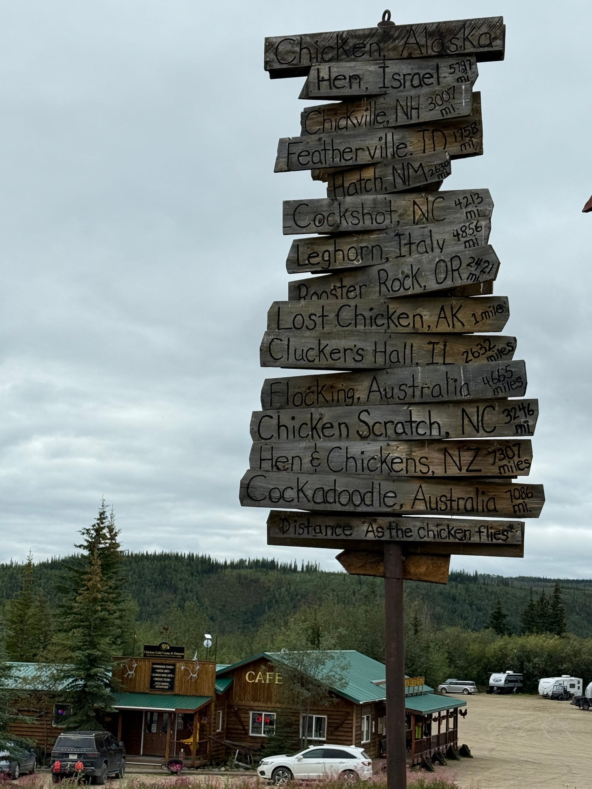 Chicken was originally named Ptarmigan, after the state bird of Alaska, but none of the original miners could spell it. So they changed the name. These days, Chicken is known for a music festival called Chickenstock which packs the town one weekend in June. Beyond that, they really play into their name, with chicken jokes everywhere. The metal chicken statue was made from recycled school lockers from the city of Homer.