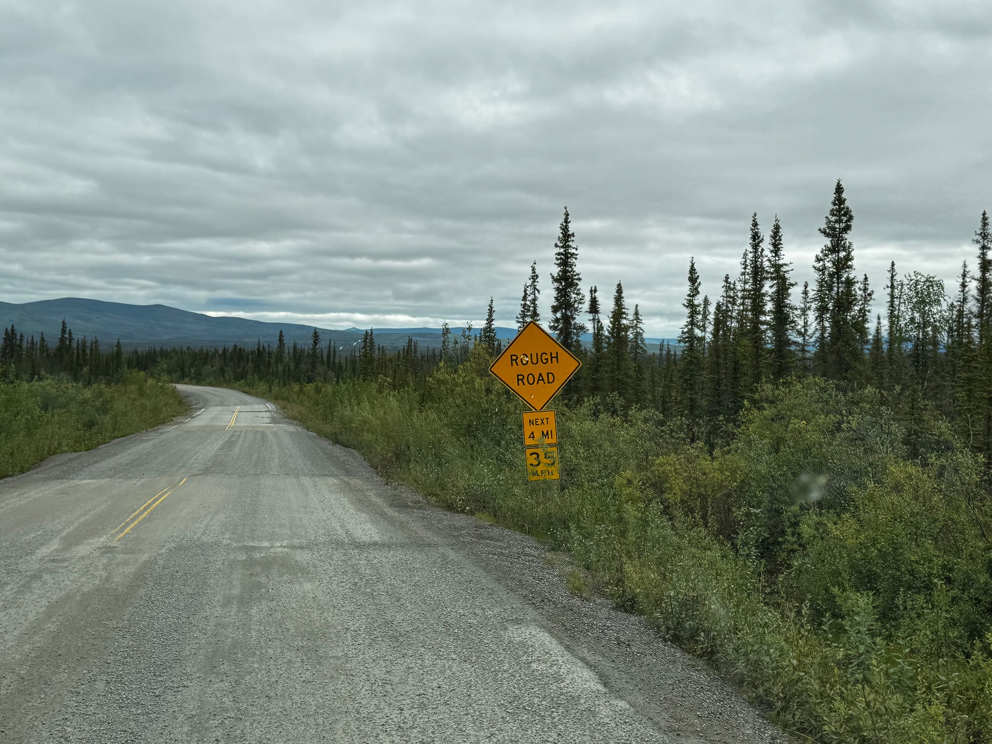 Yesterday’s drive was mostly uneventful. Once we passed Glennallen, we connected with the route that goes from Anchorage to the Canadian border. There are a lot of RV caravans in the more popular areas of Alaska. Unlike our caravan in Mexico, the Alaska RV caravans we have seen only start and end the day together; they drive separately during the day. As you can probably figure, we were caught in the middle of one of these caravans, one that consists mostly of large Class A Motorhomes (big bus style). They are pretty slow, and passing them on a two lane road can be tricky. When we reached a point where we could pass, we came upon a frost heave that wasn’t easy to see. We hit the bump going way too fast and the RV had a bit of hang time! 0/5 stars, not recommended. Luckily our rig survived. The only casualty was a couple of 3D printed clips that Greg made to store chairs in the gear garage.