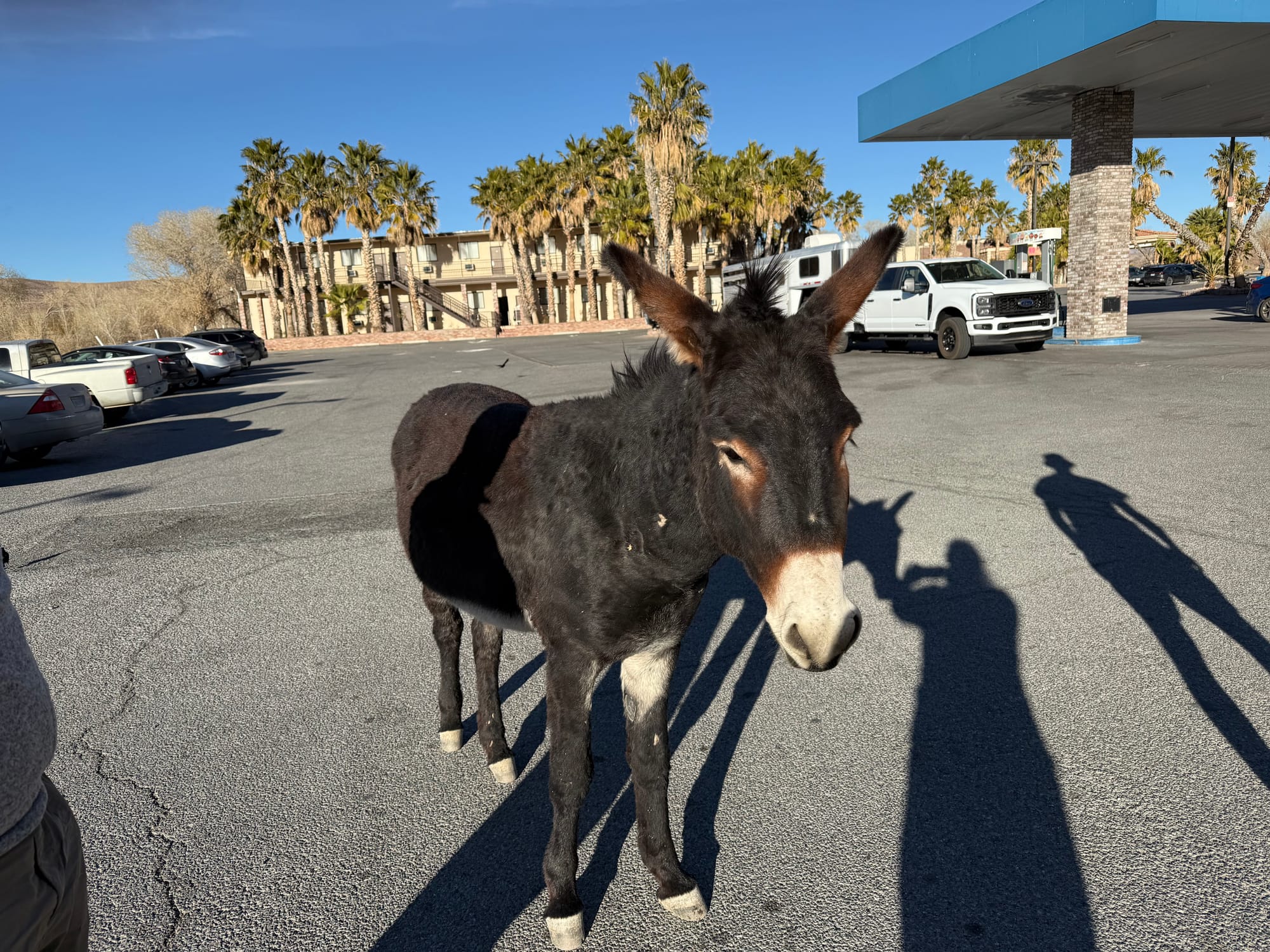 Next, we stopped at a Tesla Supercharger in Beatty NV. Wild burros were walking in the town. They seemed very friendly, probably since they learned they can get handouts from people. While we waited, we took Ari into his first casino, where a slot machine made quick work of the $1 we gave him.