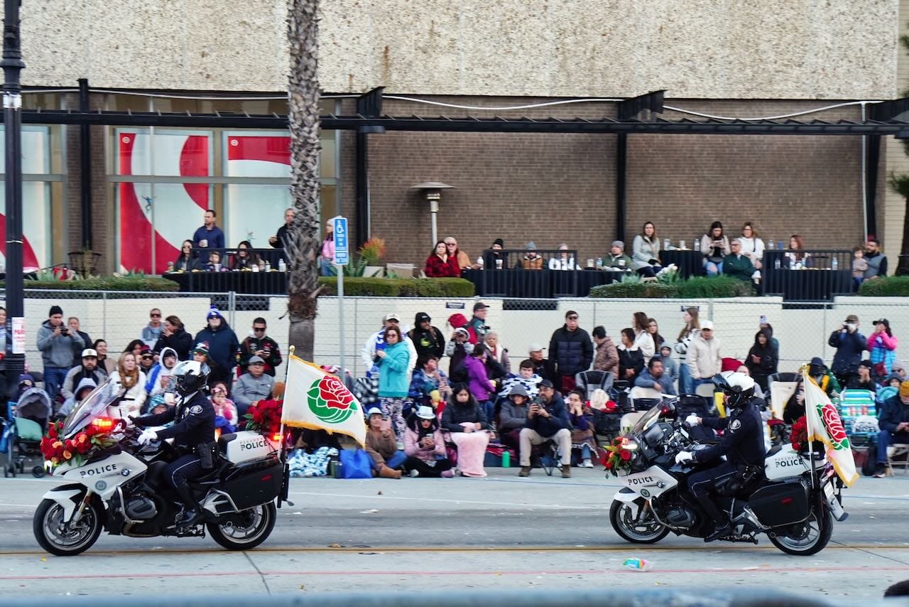 While we waited for the parade to start, a boy across the street sang karaoke. He was trying hard, but he was off-key and really needed music lessons. Just before the parade started, police officers cruised back-and-forth on motorcycles decorated with roses and flags with roses.