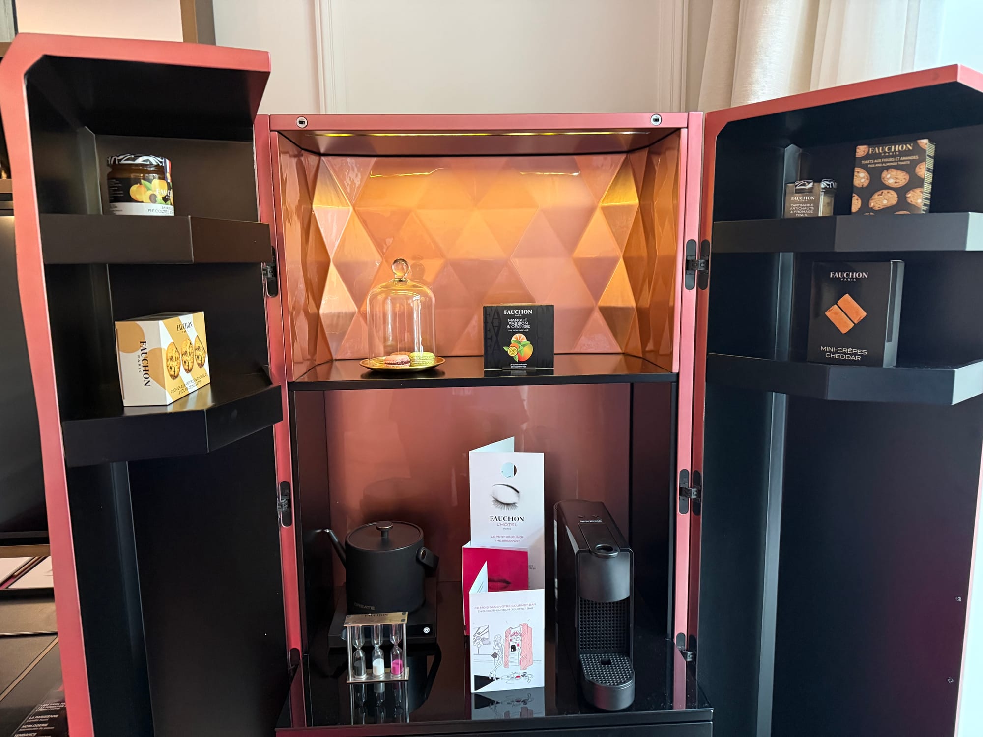 When Greg researched hotels, he found that the Fauchon gourmet shop now has their own boutique hotel. Although our room was not ready when we arrived, they welcomed us in the reception with a cup of café au lait for Amy, a cup of green tea for Greg, and a selection of fresh pastries. The best part is that the room is stocked with their coffee, teas and gourmet snacks, which are included with the room rate! (Only the alcohol in the minibar is not included, which is no problem for us).