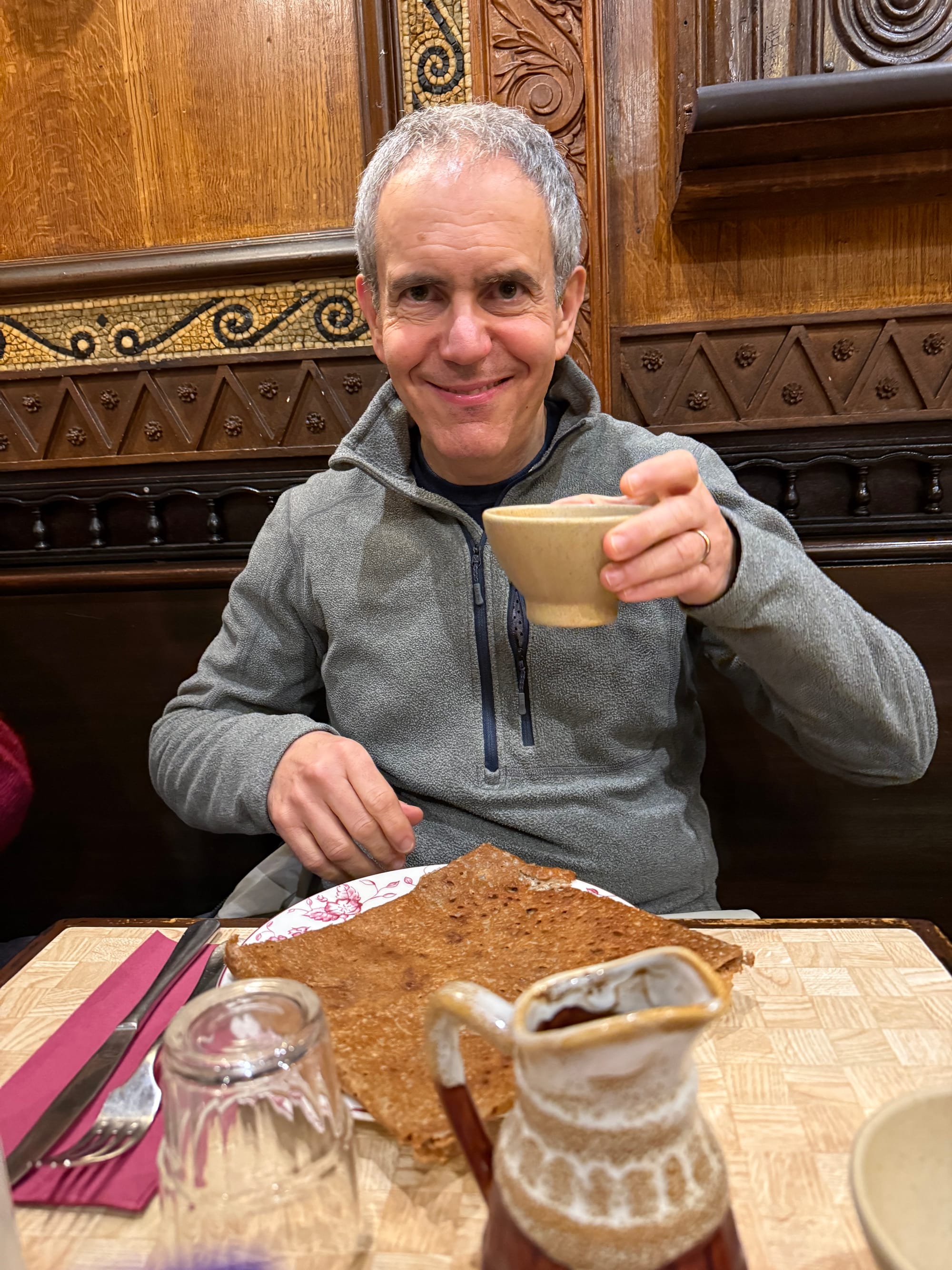 Following tradition, we went to Crêperie de Josselin for - what else? - crepes for dinner. Greg had his usual - forestière (mushroom), a salad and a small pitcher of hard cider, while Amy had the vegetarian and a salad. Note that a savory crepe in France is made with buckwheat flour, unlike a sweet dessert crepe, which is made with wheat flour.