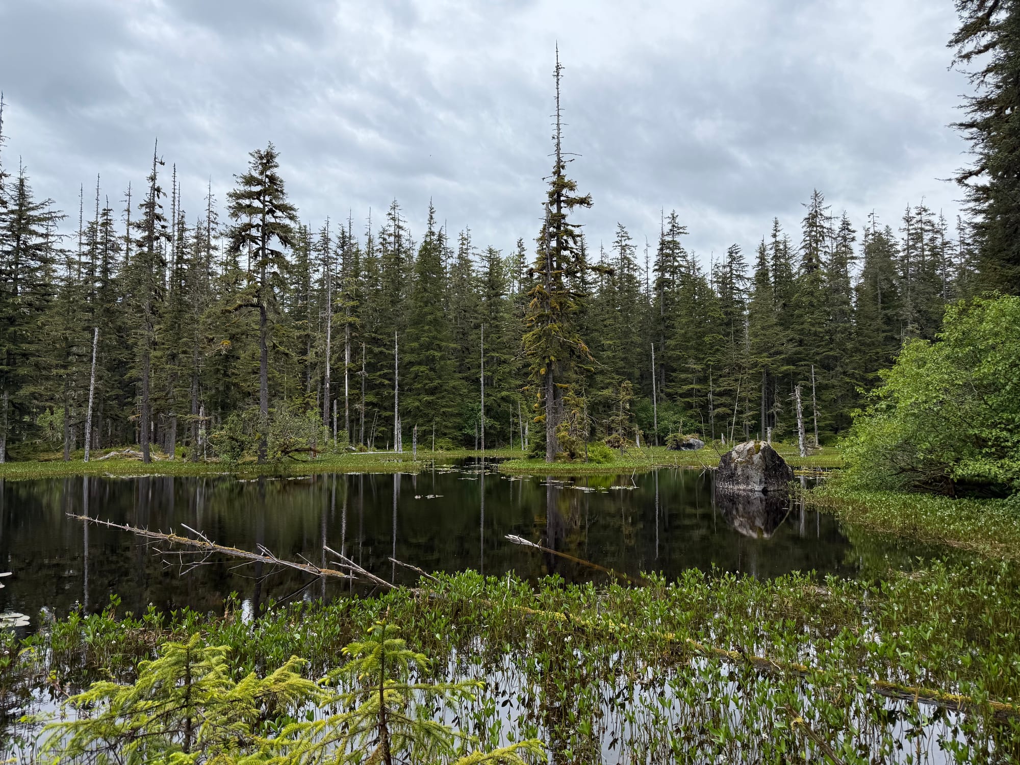Since no one was around, we decided to check out the visitor center for Glacier Bay National Park, about 15 minutes away. As we drove up, a ranger was standing outside of the visitor center. So we asked if she was running a program. Ranger Miranda said she was leading a nature walk around the Bartlett Cove area. Our timing was perfect. She showed us how the landscape has changed in the past 200 years since the Glaciers receded from this area. Scientists have been monitoring the area to watch how the forest has grown. She showed us granite rocks that were placed here by the glaciers and how animals have migrated into the area. Also, she pointed out her favorite trees (!).