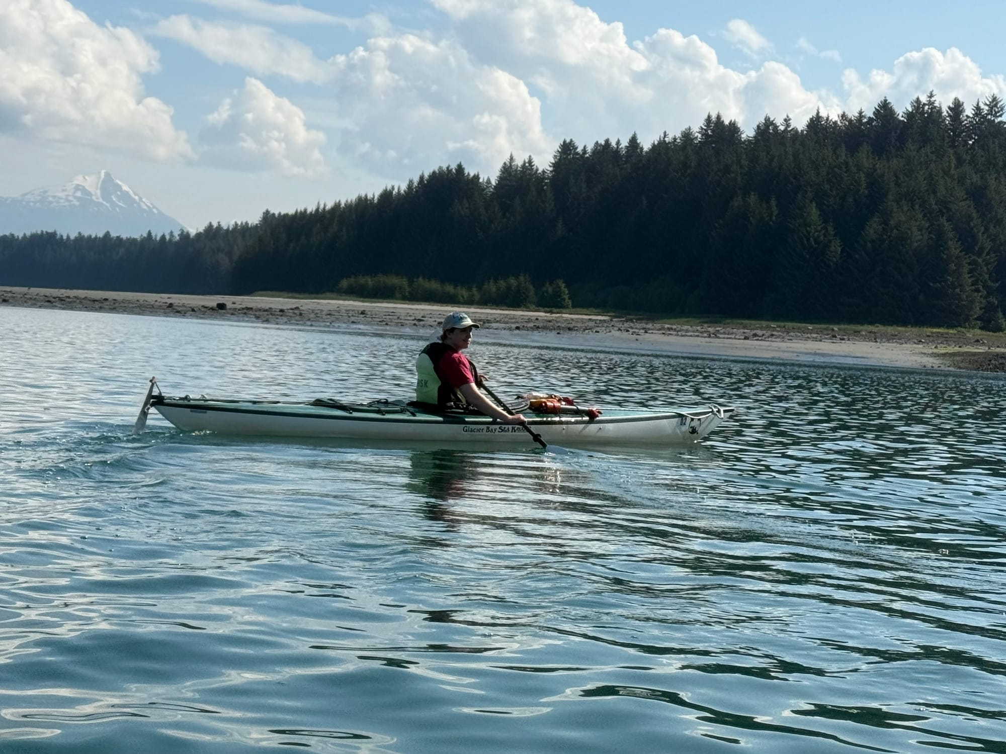 When we go kayaking ourselves, it’s pretty informal: we get out our kayaks, don some gear, and start our trip. It takes about 20 minutes to get onto the water. Sea kayaking is more involved: more gear (like spray skirts, rubber boots), more complex kayaks (rudders, bailing pumps), etc. It took about an hour for everyone to get ready. While we waited, we learned that one guide grew up in Redmond WA (about 15 minutes from our home in Bellevue), and the other guide lives next to our RV camp and saw Greg running all week. It’s a small world after all.