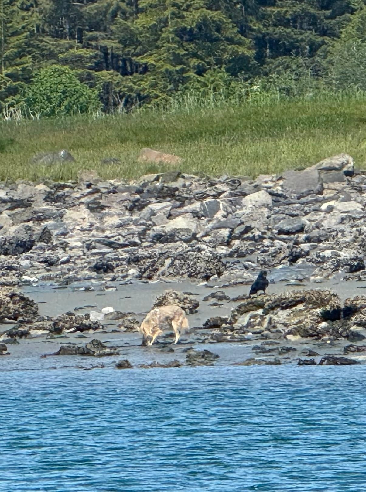 So we explored Bartlett Cove, where the Glacier Bay dock is located. Around the halfway point, the guides got really quiet and pointed towards the shore. We first saw a bald eagle, not on the treetops but at the waterfront. Nearby, a coyote was walking back and forth on the beach. Maybe the eagle and the coyote were fishing together.