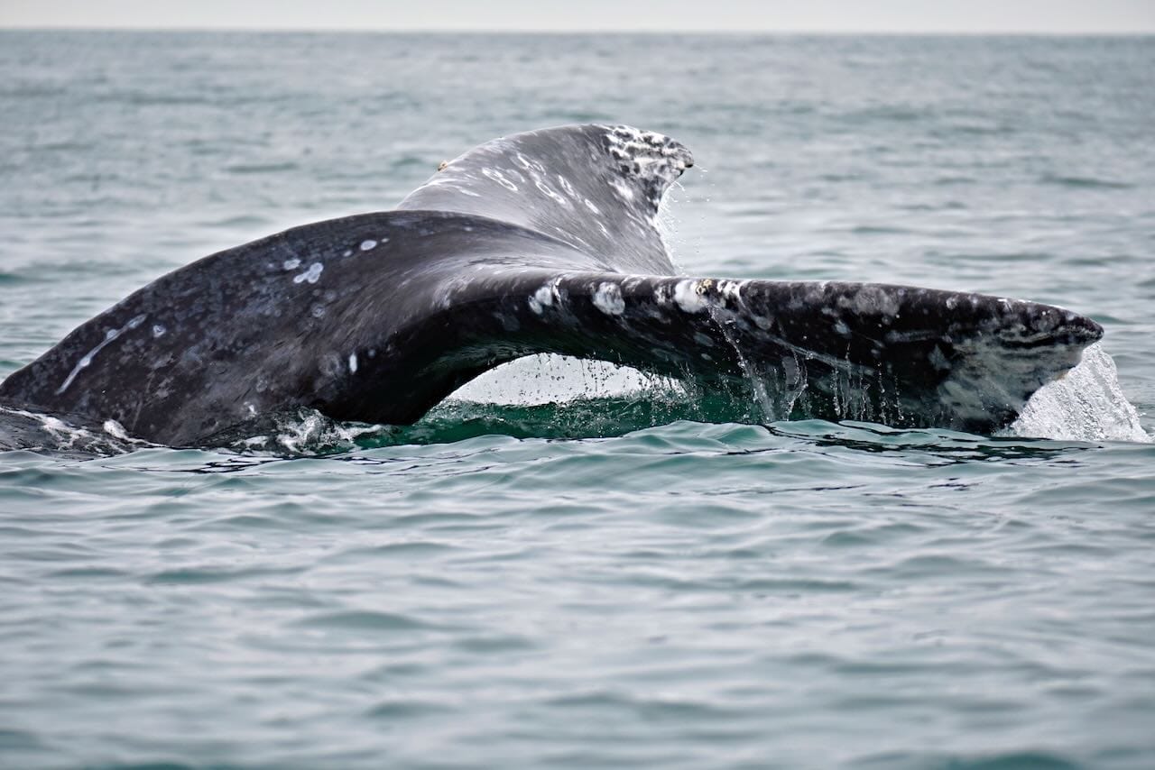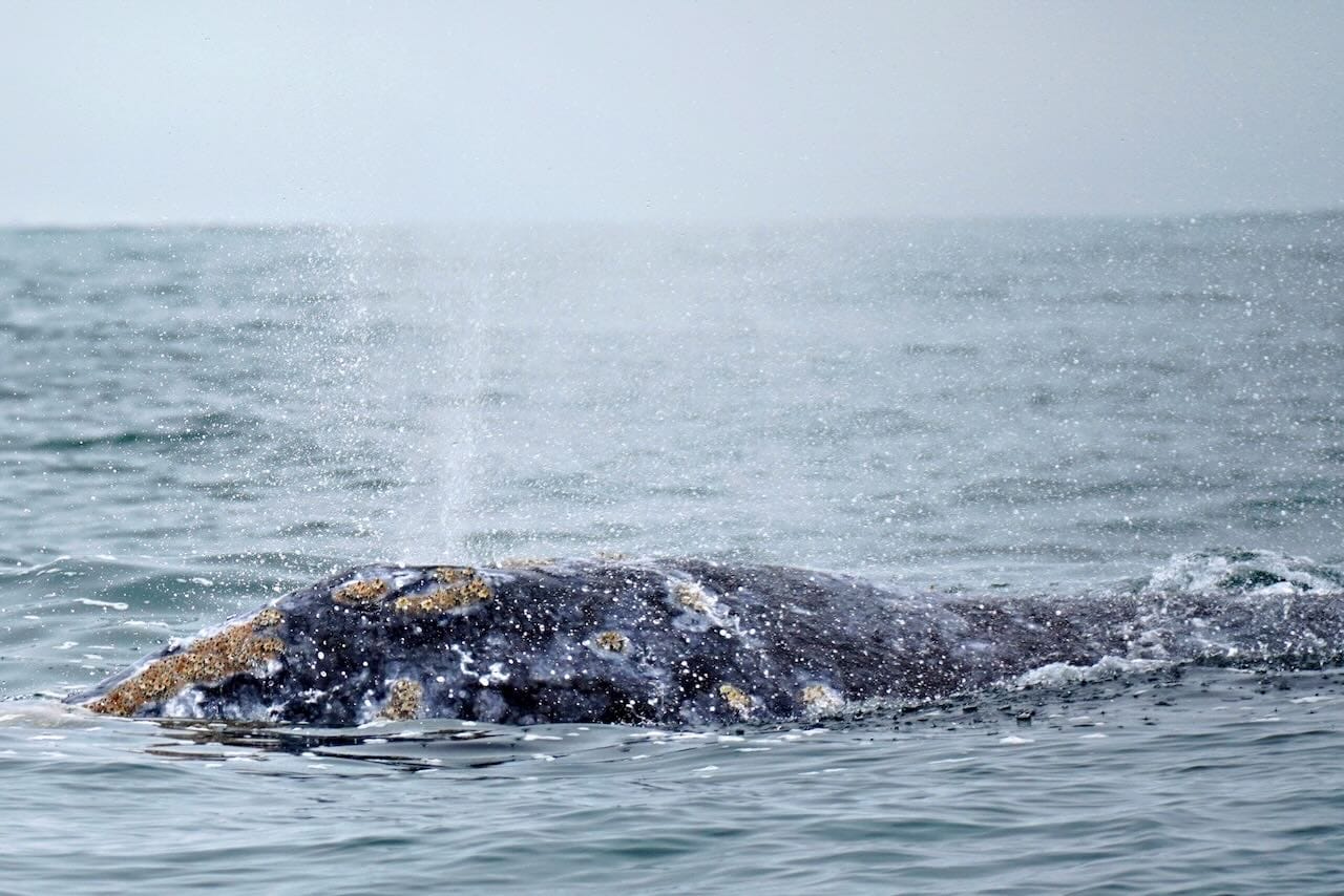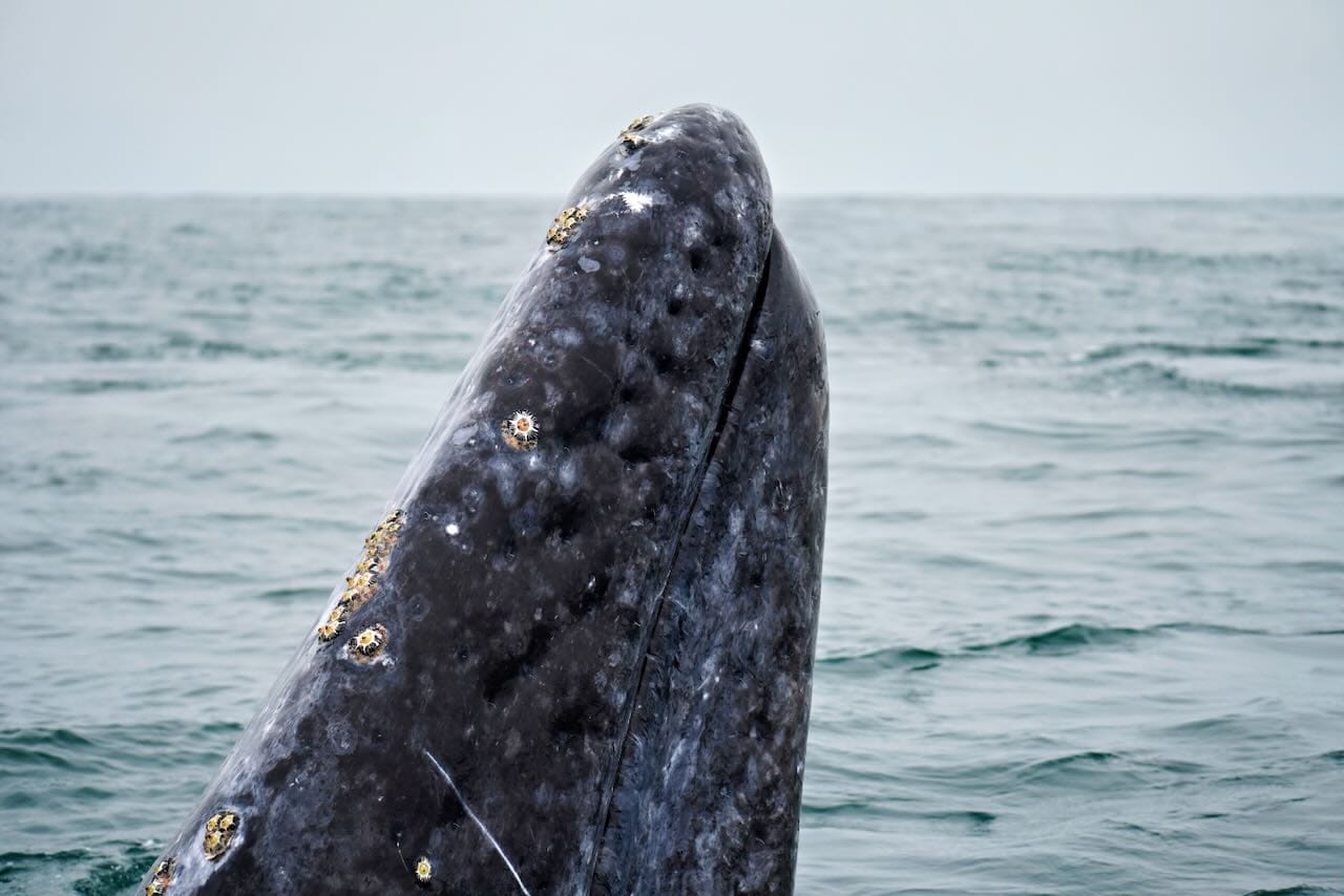 We've never seen so many whales before. Often, there were up to 5 or 6 within a few boat lengths. They would swim around and underneath our boats. Barnacles attach to gray whales but don't seem to affect them, apart from bleaching their skin white.