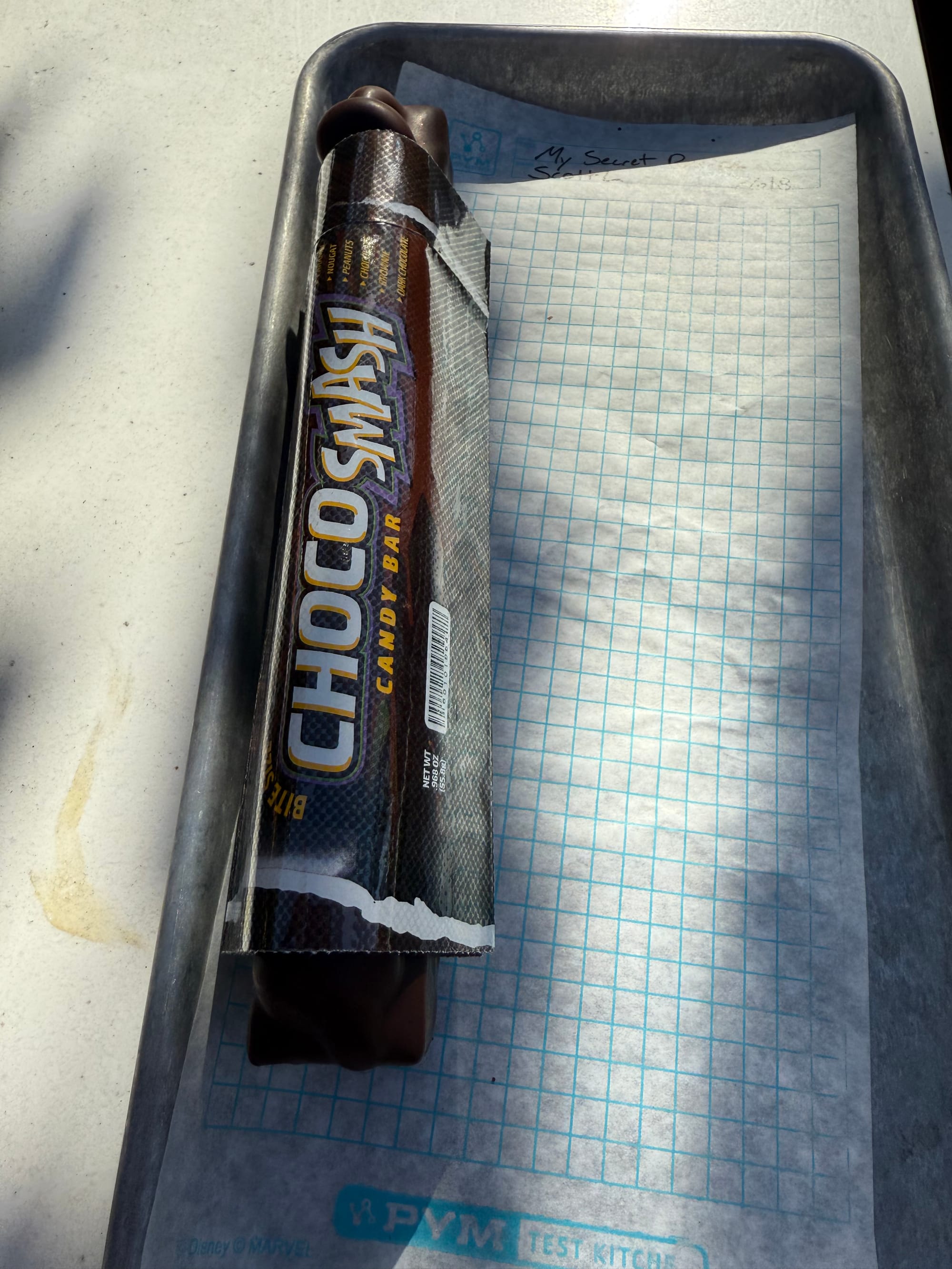 But my favorite thing that I ate during the trip was at Pym’s Test Kitchen in Avengers Campus. If you‘re not familiar with Marvel, Dr. Pym is a scientist who discovers a way to make things shrink or expand. So everything in the Pym’s Test Kitchen restaurant is comically large or small. The dish is the ChocoSmash bar: a huge candy bar which was plenty big enough for the three of us to share. The restaurant was a lot of fun.