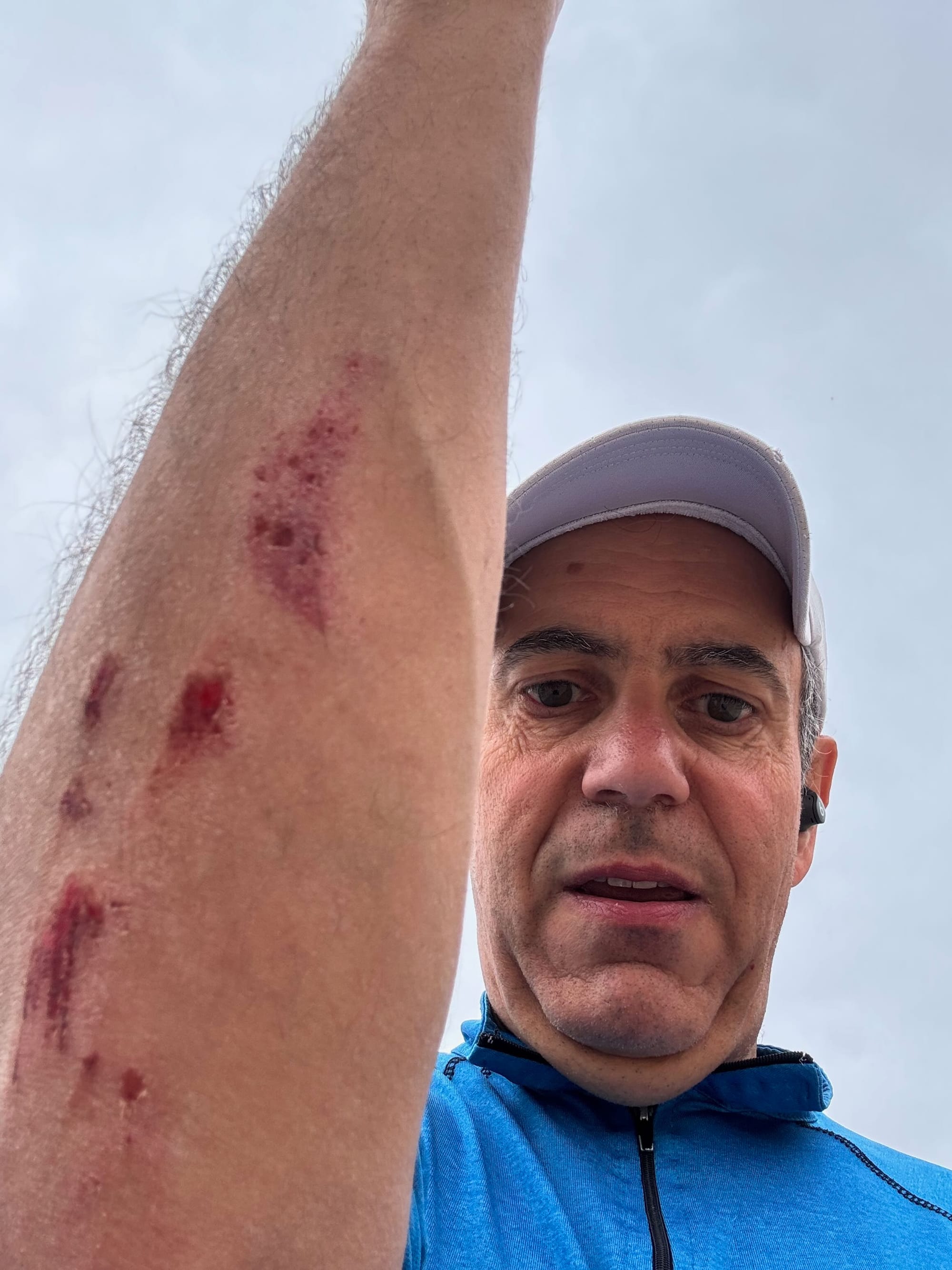 Greg took the photo above on his Thursday morning run, where he climbed a trail to the top of one of the peaks. Soon after that photo, Greg hit a patch of gravel and took a fall. Fortunately, we have a well-stocked first aid kit in the RV. When others from the caravan see the injury, they asked what happened; Greg usually tells a tale involving vultures, marauders, or whatever is on his mind at the moment. That's more interesting than telling the truth that Greg is simply clumsy.