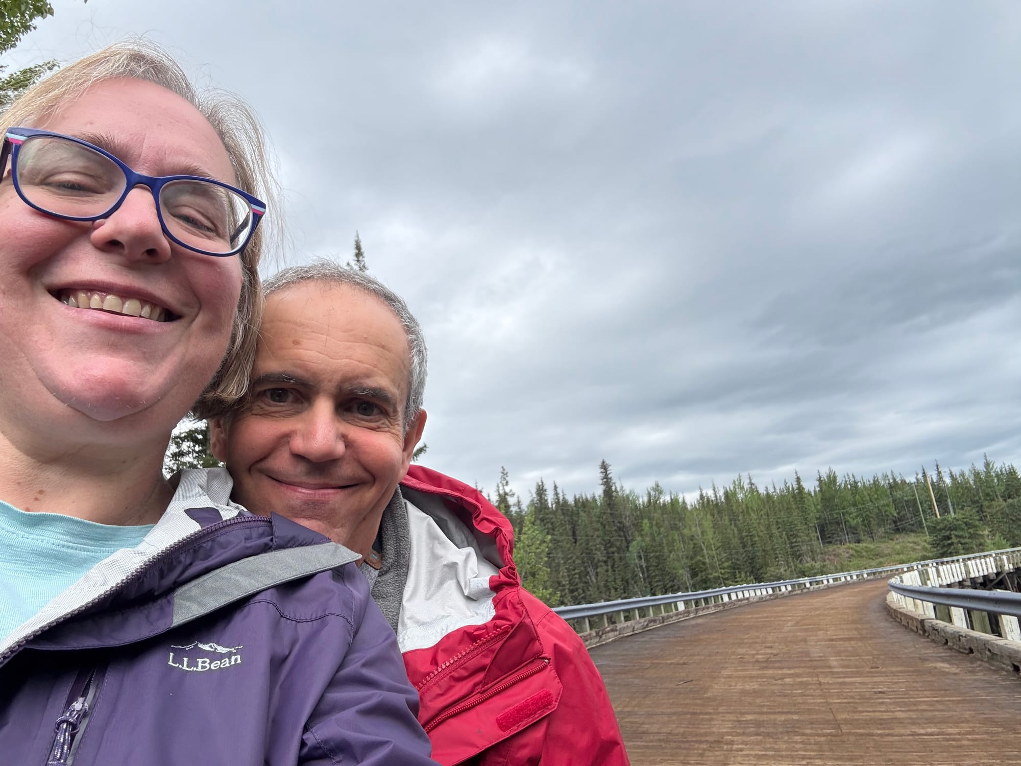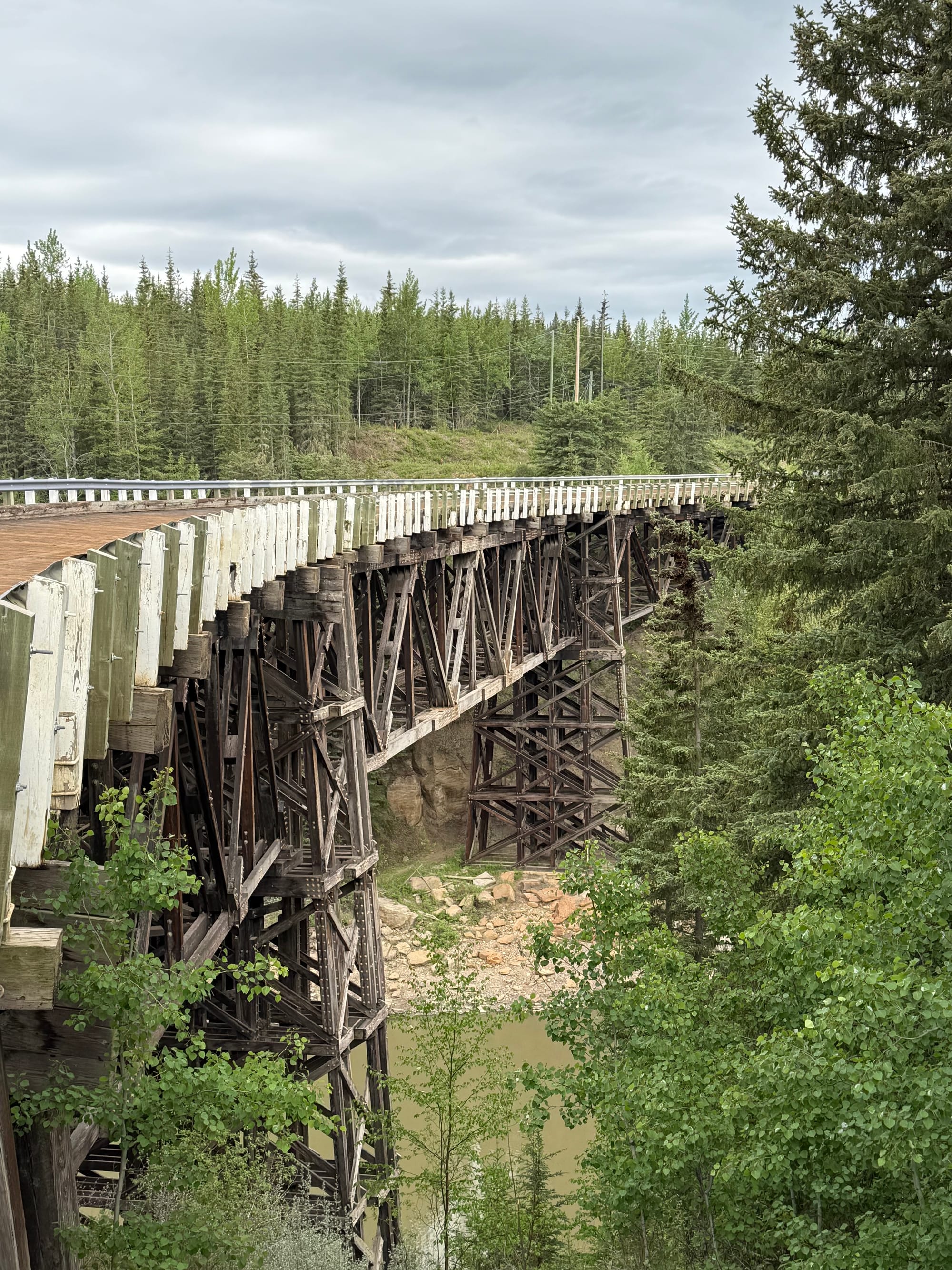 Today we started heading North and West. Our main stop was at a bridge that was an original part of the Alcan highway. It is closed to vehicles now, but the road is a wooden bridge that curved around a bend. The road surface is also tilted. It has been replaced by a more modern bridge for travel. But it was fun seeing the old one.
