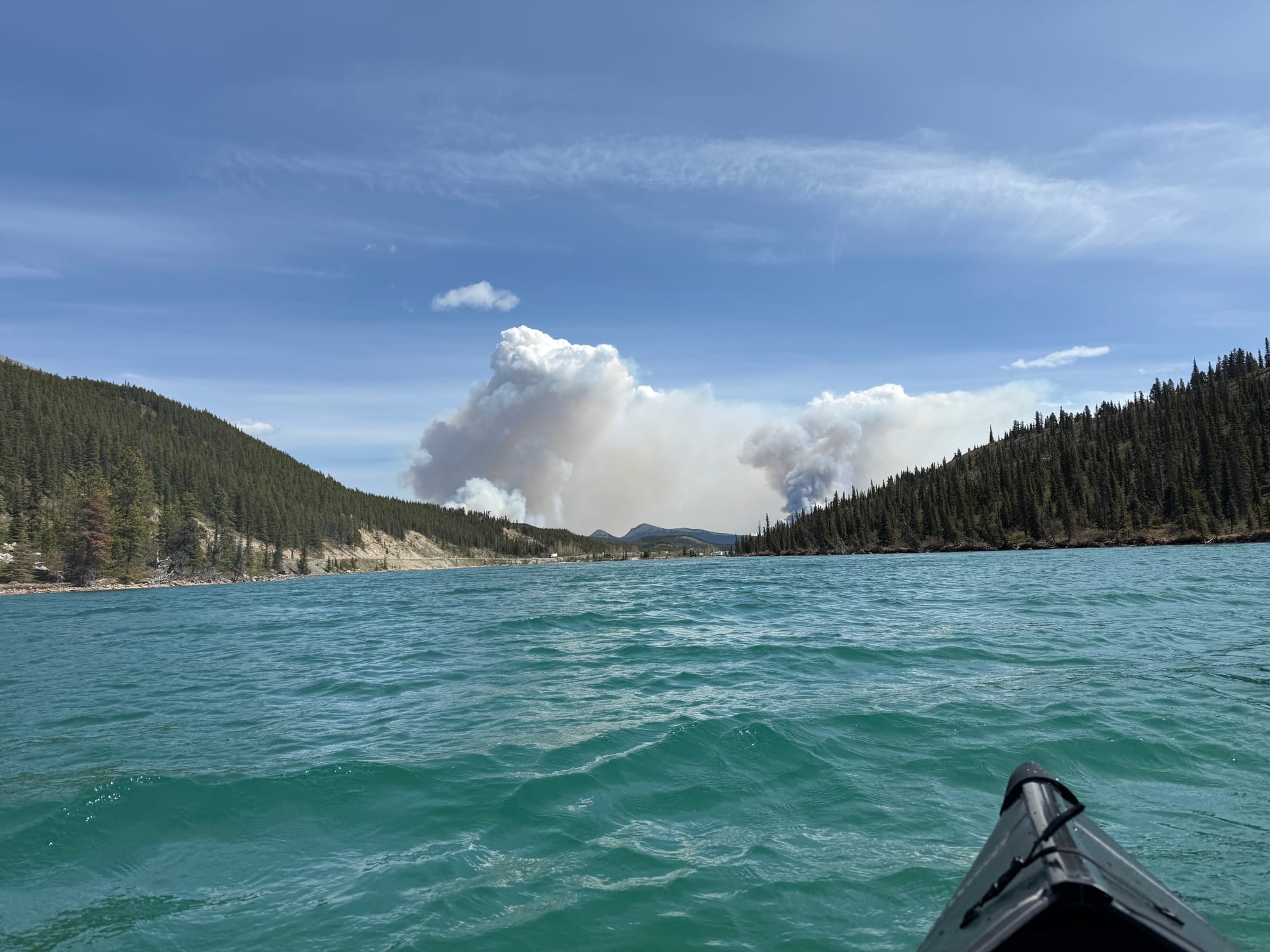 Our next planned stop was to kayak on Summit Lake, in Stone Mountain Provincial Park. (Not at all like the other Stone Mountain Park). When we left Tetsa River Lodge, the air was thick with wildfire smoke. We rounded past one mountain and saw another mountain on fire! We saw multiple plumes of thick smoke, then we saw the flames. We weren’t sure if the air in Summit Lake would be OK for kayaking, but we continued to drive.