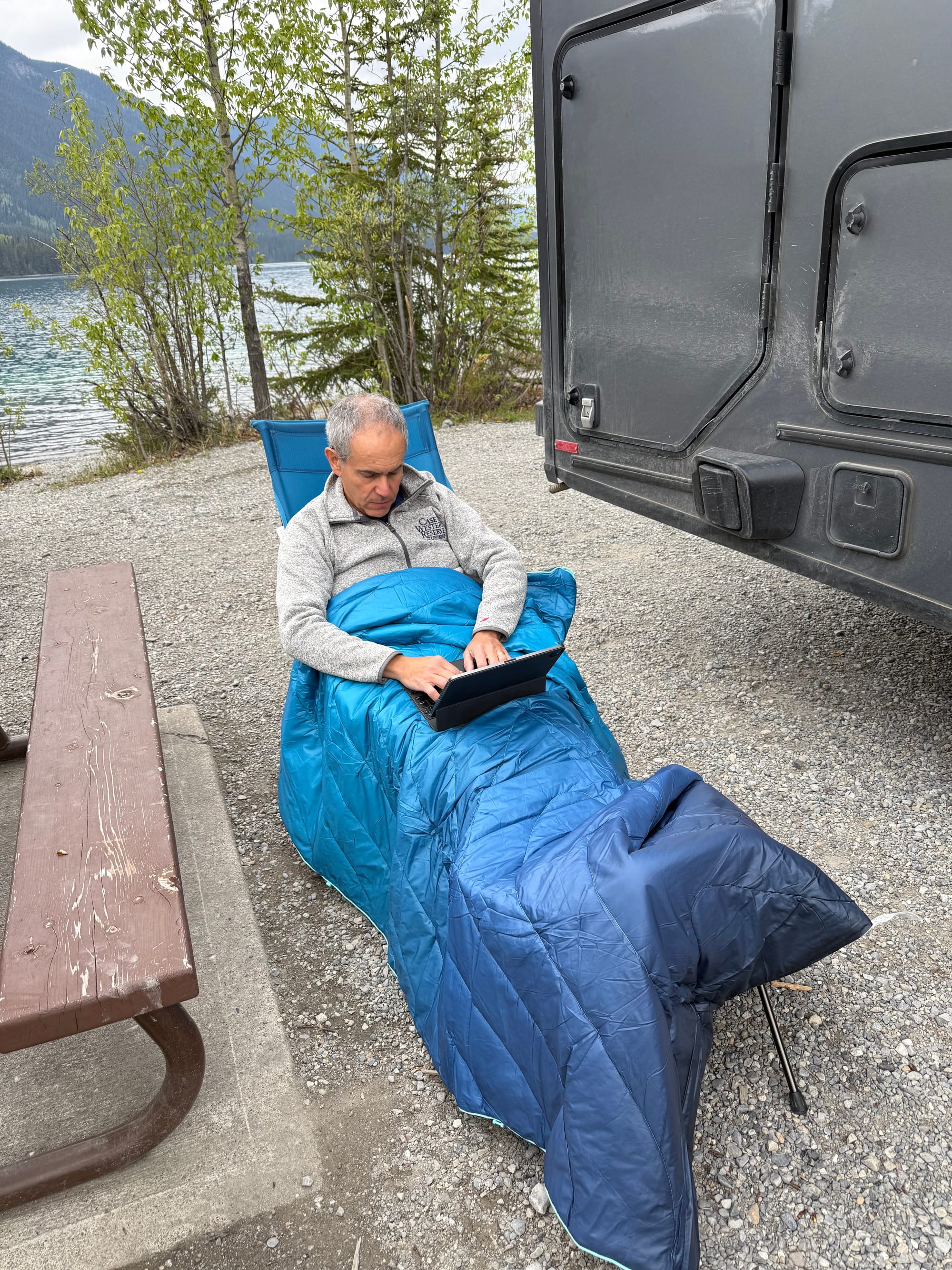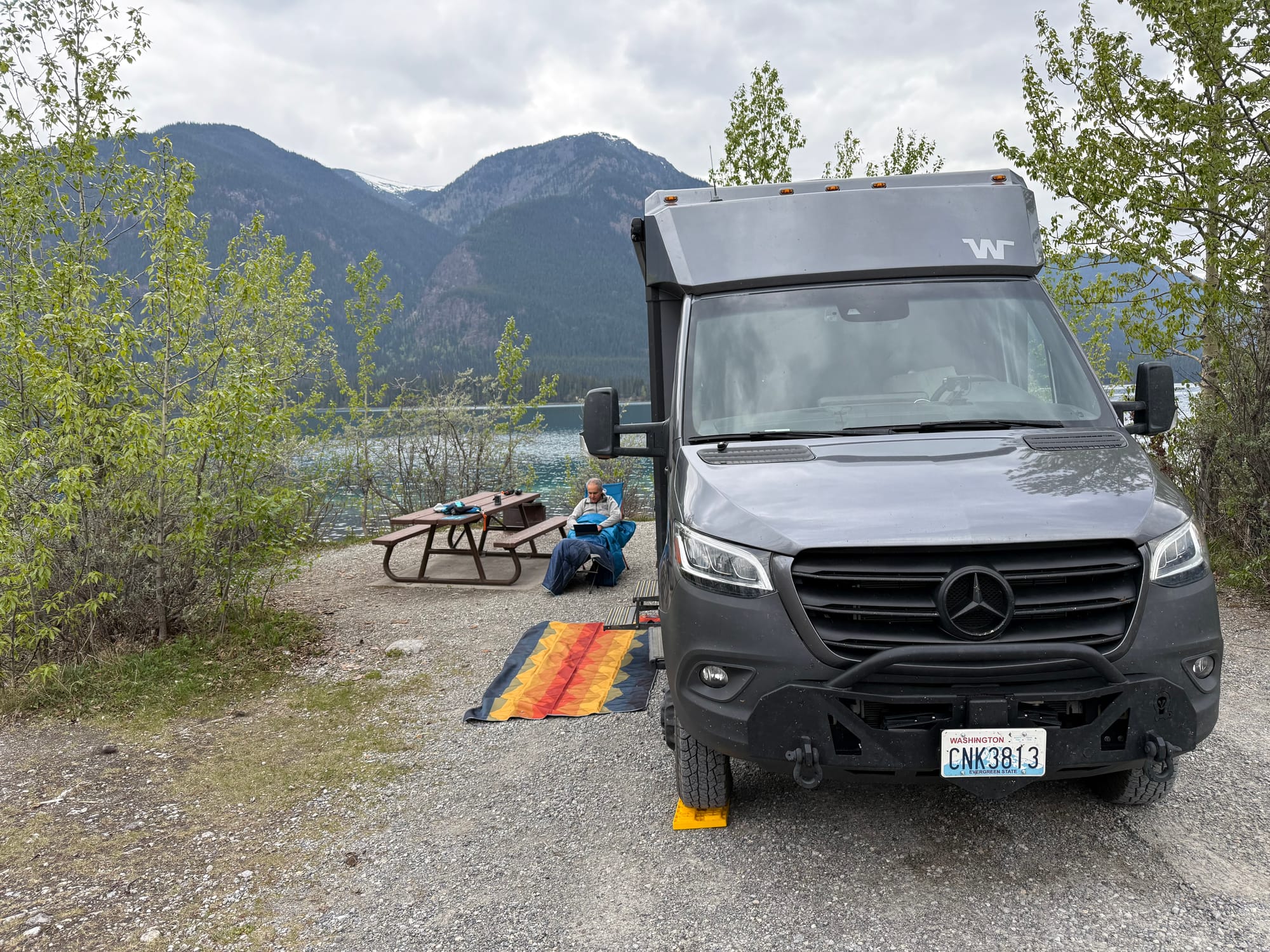 Soon, we reached Toad River, where the road was closed and many commercial trucks and RVs were stopped. We finished our drive on schedule to Muncho Lake Provincial Park. “Muncho” means big and “Lake” means lake. It is another gorgeous lake in the northern Canadian Rockies. We found a first-come, first-served campsite at MacDonald Campground. (E-I-E-I-O). Our timing was good as the campsites filled up quickly; one group asked Greg if he knew anything about the road closure, and he gave them the story. First thing tomorrow morning, we’ll launch the kayaks out the back of our campsite onto Muncho Lake.