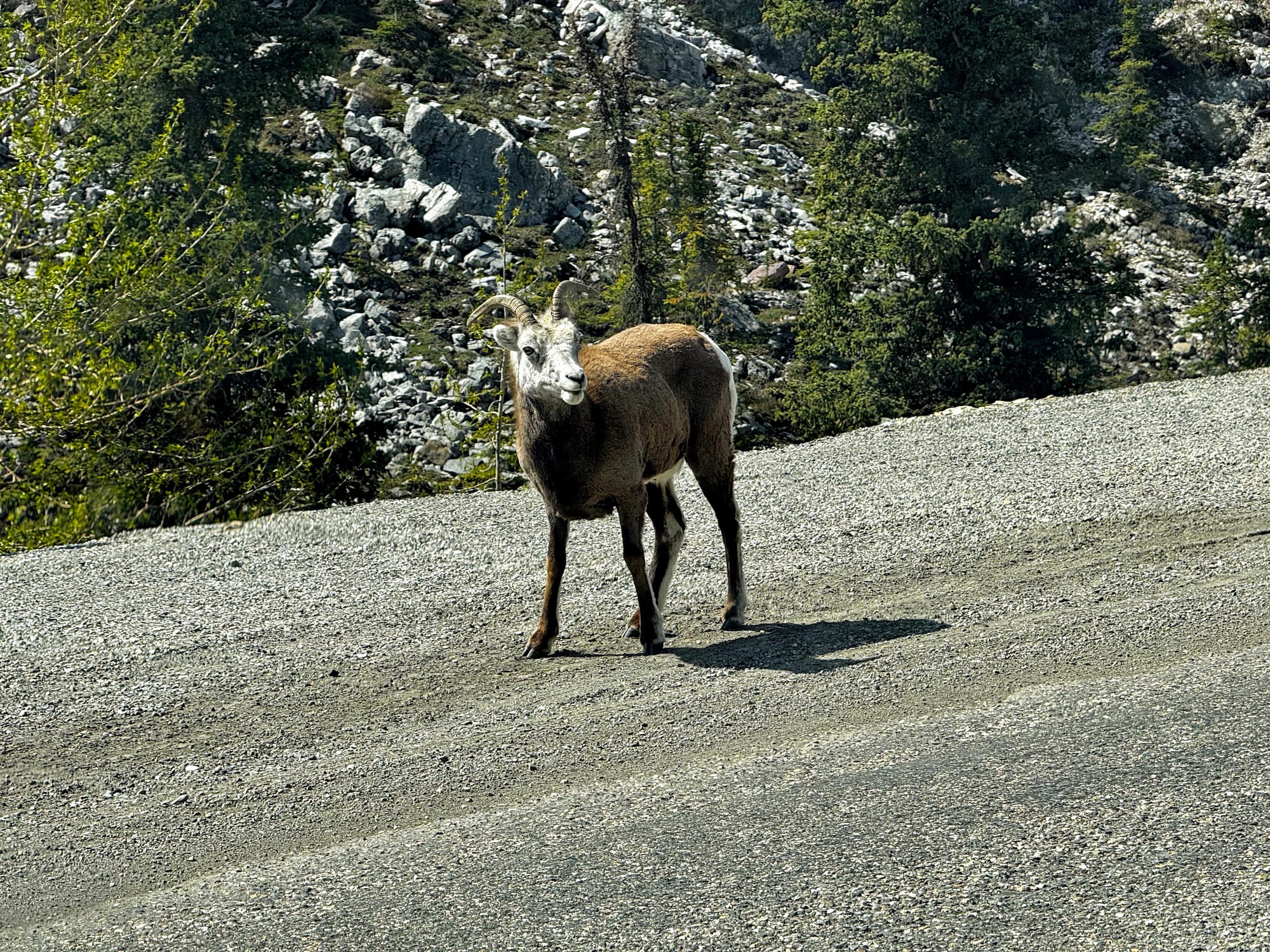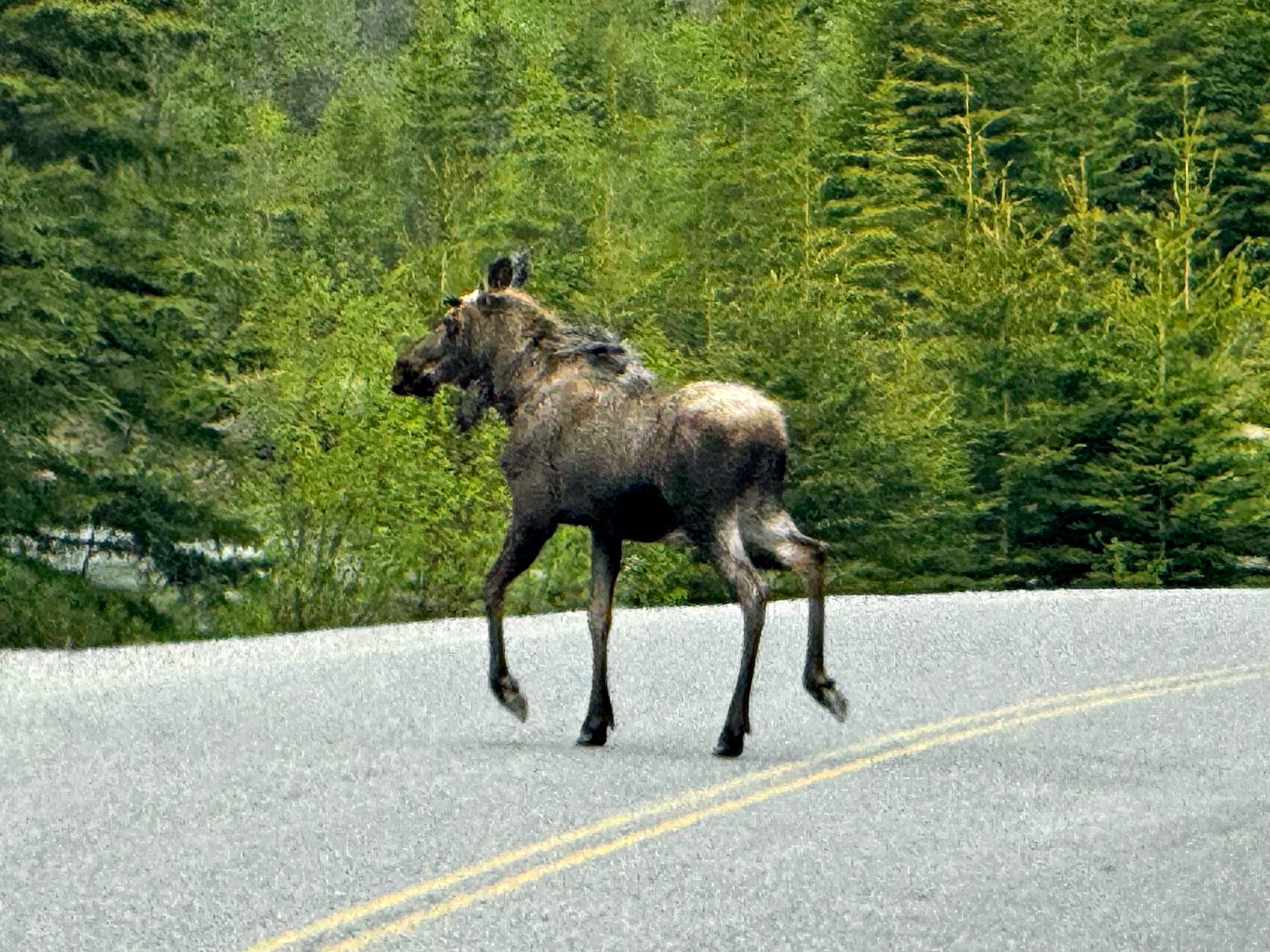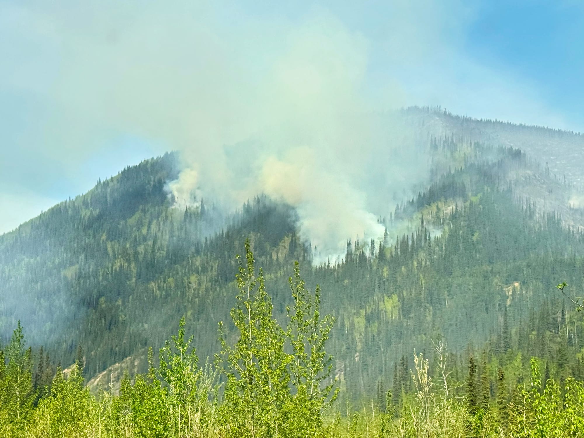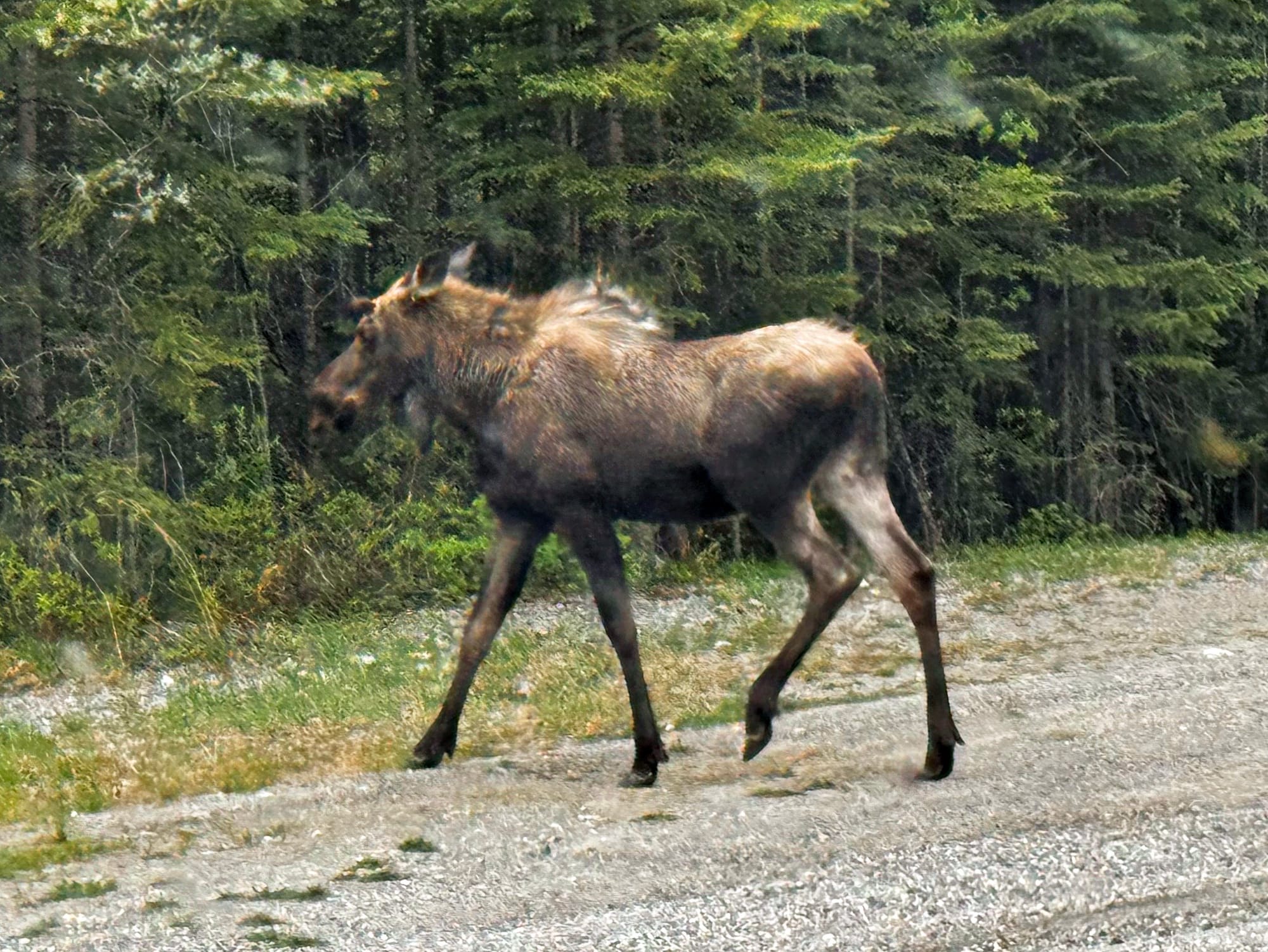 We cleaned up and had some lunch. Since we passed the fire, it seemed safe to continue. When we resumed the drive, Greg checked the internet and read that section of the Alaska Highway was closed due to the wildfire. Had we stopped for those cinnamon buns, the road may have been closed and we would have been stuck. Worse, there are only 2 roads to Alaska; it would have taken days to backtrack to the other highway. The Alaska Highway was even more quiet than normal, but this helped us see wildlife including deer, moose and stone sheep, which look like large goats. No bears today, though.