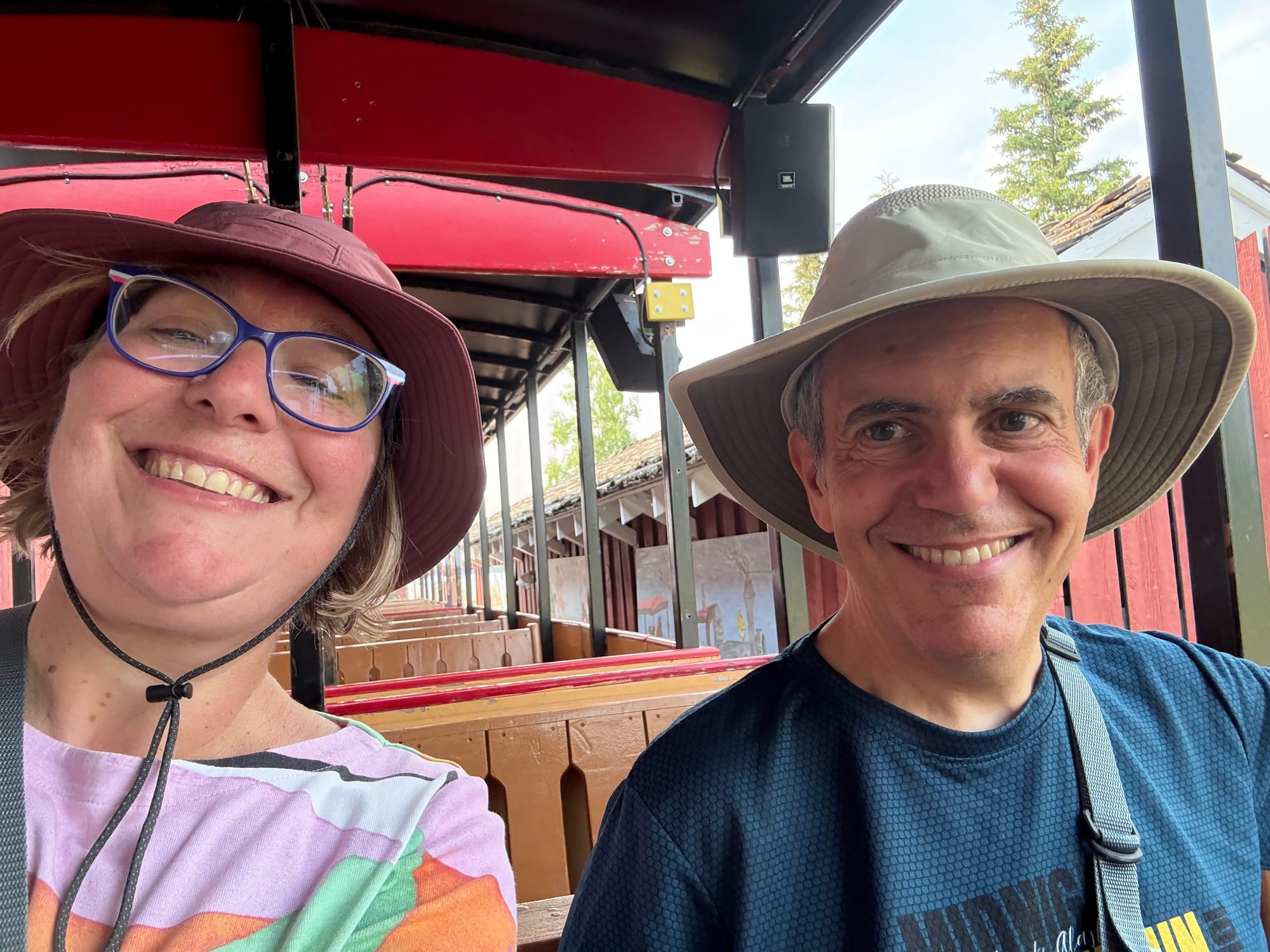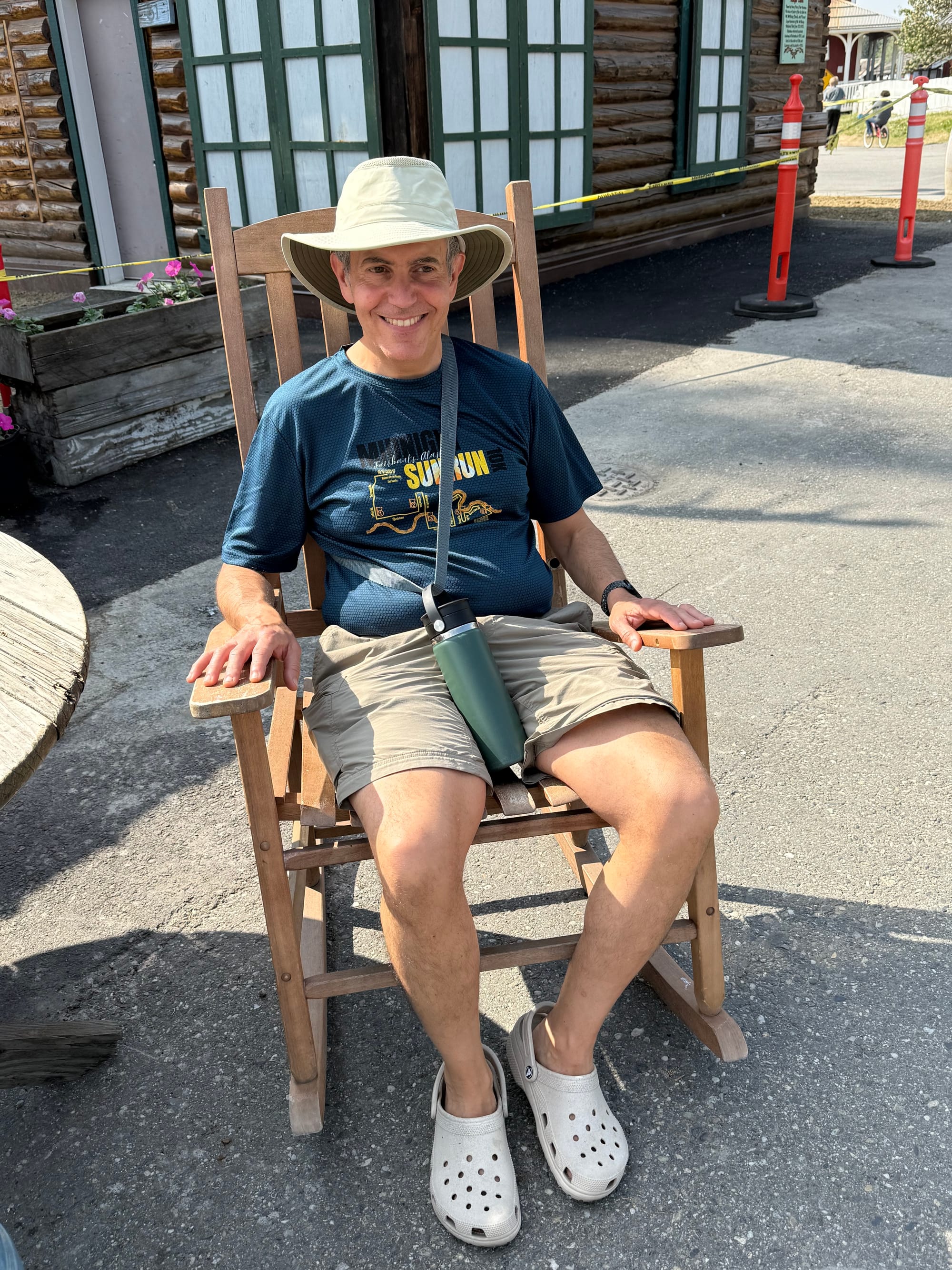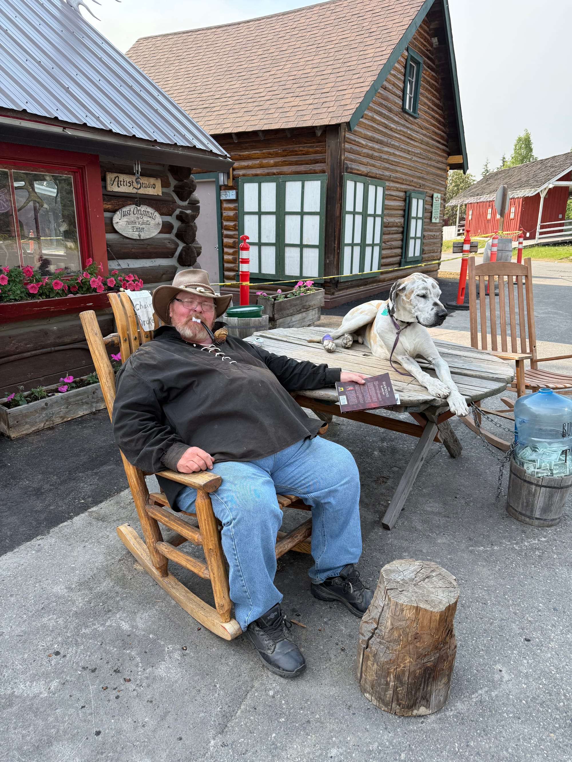 We are saving the best part of Pioneer Park for last! One of the log cabins had an artist displaying his work. He carved wood, antlers and horns. Outside the cabin were two rocking chairs. Greg sat in one because the other one was labeled as broken. This big guy decides to sit in the broken chair. Amy tried to warn him, but it turns out the chair was not broken. It was Justin, the artist. He put the sign up to keep people from sitting in his chair. His rescue Great Dane came by and demanded to be pet. Then we heard Justin’s life story: growing up in Alaska, going away to study art, going to LA to try to be an actor, working in a traveling jousting show, then returning to Alaska. He even built his own log cabin with wood that was reclaimed after a fire (it was half price that way). He built it himself with some help from a buddy because the logs were too heavy for one person. The buddy suggested that he had enough wood to make a loft. So now he works over the summer selling his art that he produces during the long winters. Justin is a true Alaskan!