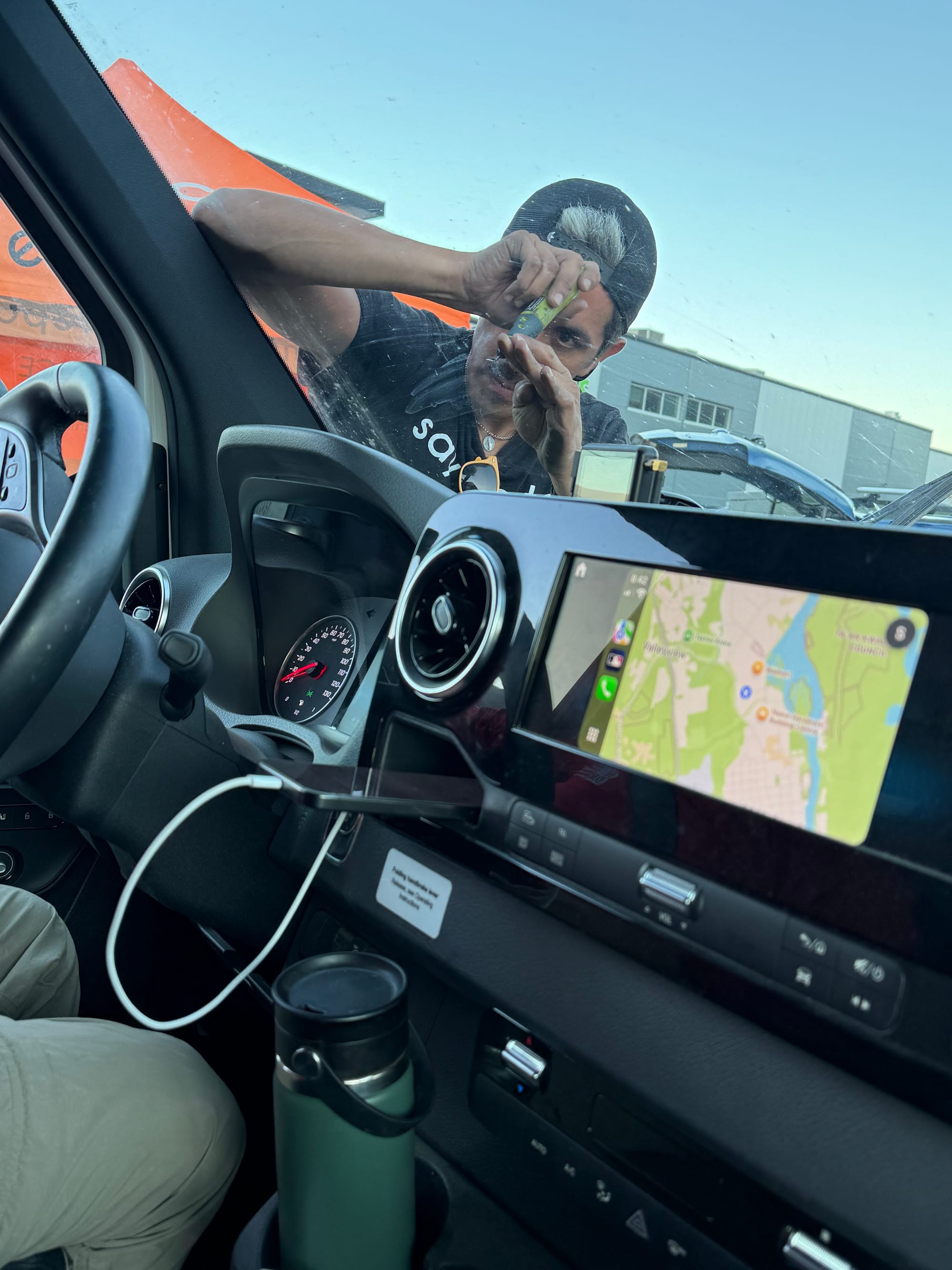 After dinner, Greg realized he needed some parts to work on the heater, so Amy and Greg drove to the Canadian Tire store. In the parking lot was a tent with a guy doing windshield chip repairs. After we bought the parts, we drove over to the tent. Although it was late, the guy said it would be no problem and he could fix the windshield while we waited. When he inspected the windshield, he found a second, smaller rock chip. "You drove on the Dempster Highway, right?" How did you ever know! While we waited, his 10-year-old daughter Maria came by and talked to us about her two businesses: one to clean bugs off cars, the other to offer advice. We were just at the car wash so we didn't have bugs, but we did pay Maria CAD $1 to get 3 pieces of advice: where is the best place for dessert in Whitehorse ("Boston Pizza"), where is a good place to visit in Whitehorse ("Chadburn Lake and Carcross"), and what do you like best about Whitehorse ("the sunsets"). We said how much we liked visiting Carcross when we were here in June. Maria was adorable, and it was a great way to pass the time while her father repaired the windshield chips. Two repairs complete!