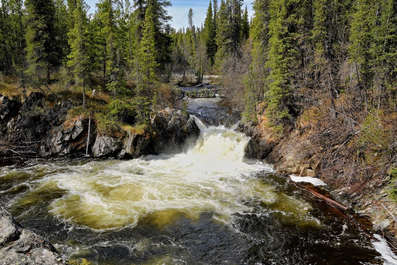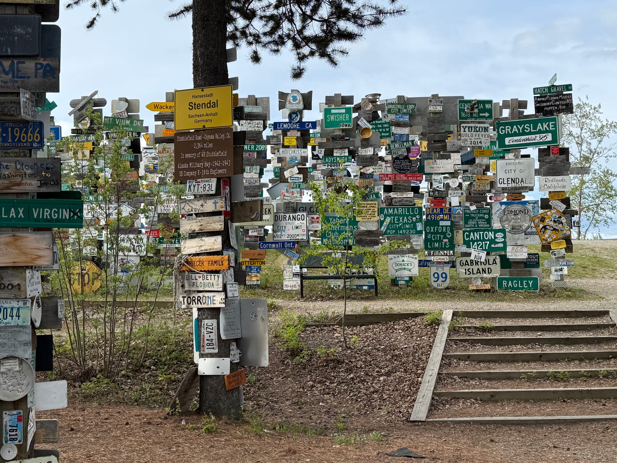 Today was a long driving day with 3 scheduled stops along the way. First, we returned to Watson Lake. Greg went for a run along the Alaska Highway, then we visited Sign Post Forest. The idea is cute: people post signs from their home, like street signs and license plates. There were signs from across Canada, the US, Europe and beyond. But it was really more of a collection of junk like frying pans with names written on it. Someone even posted a pair of jumbo underwear! Gross! We spent 5 minutes at Sign Post Forest, which was about 4 minutes too long. Before we left town, we fueled up since we were entering another long segment without services.