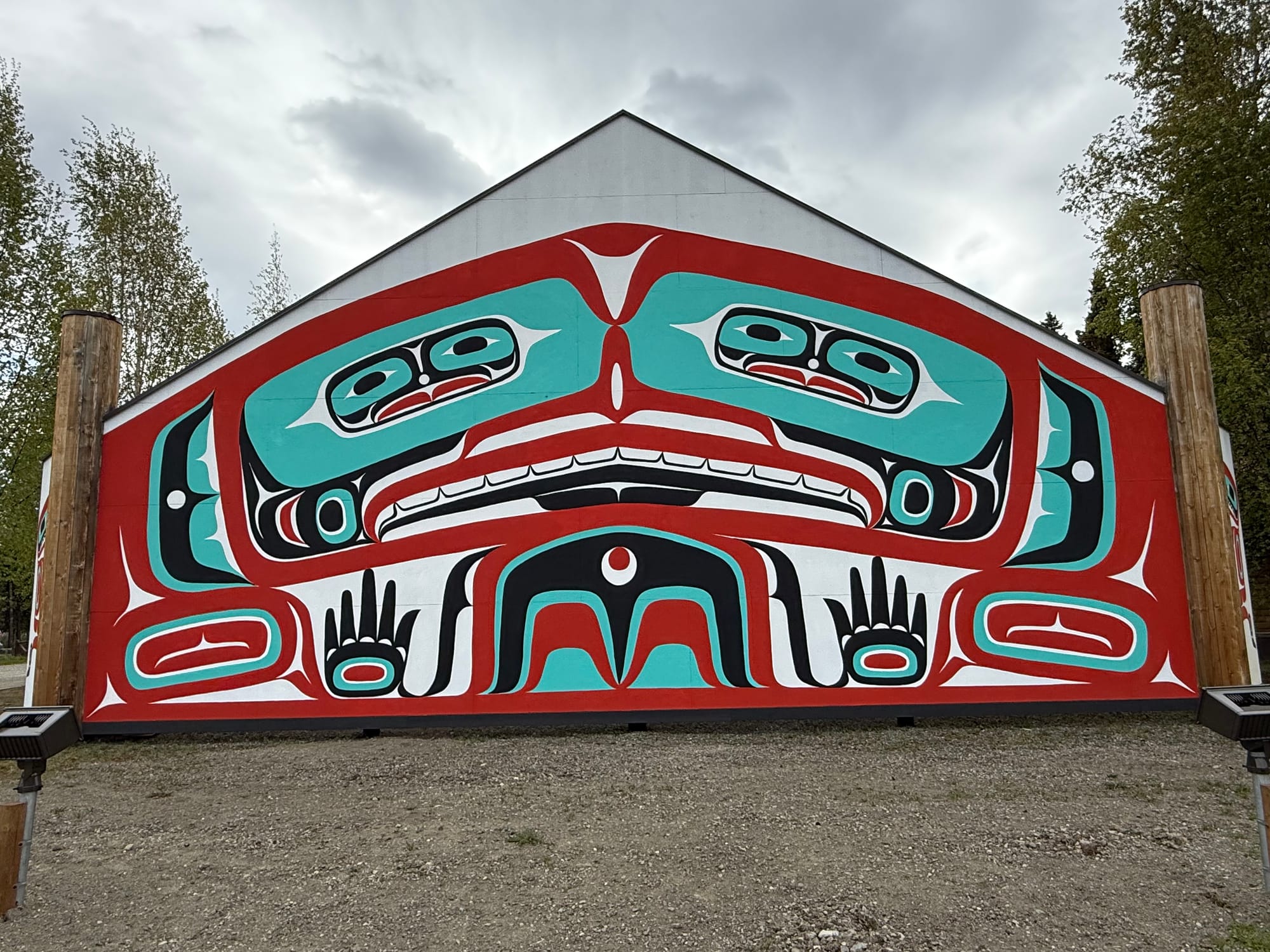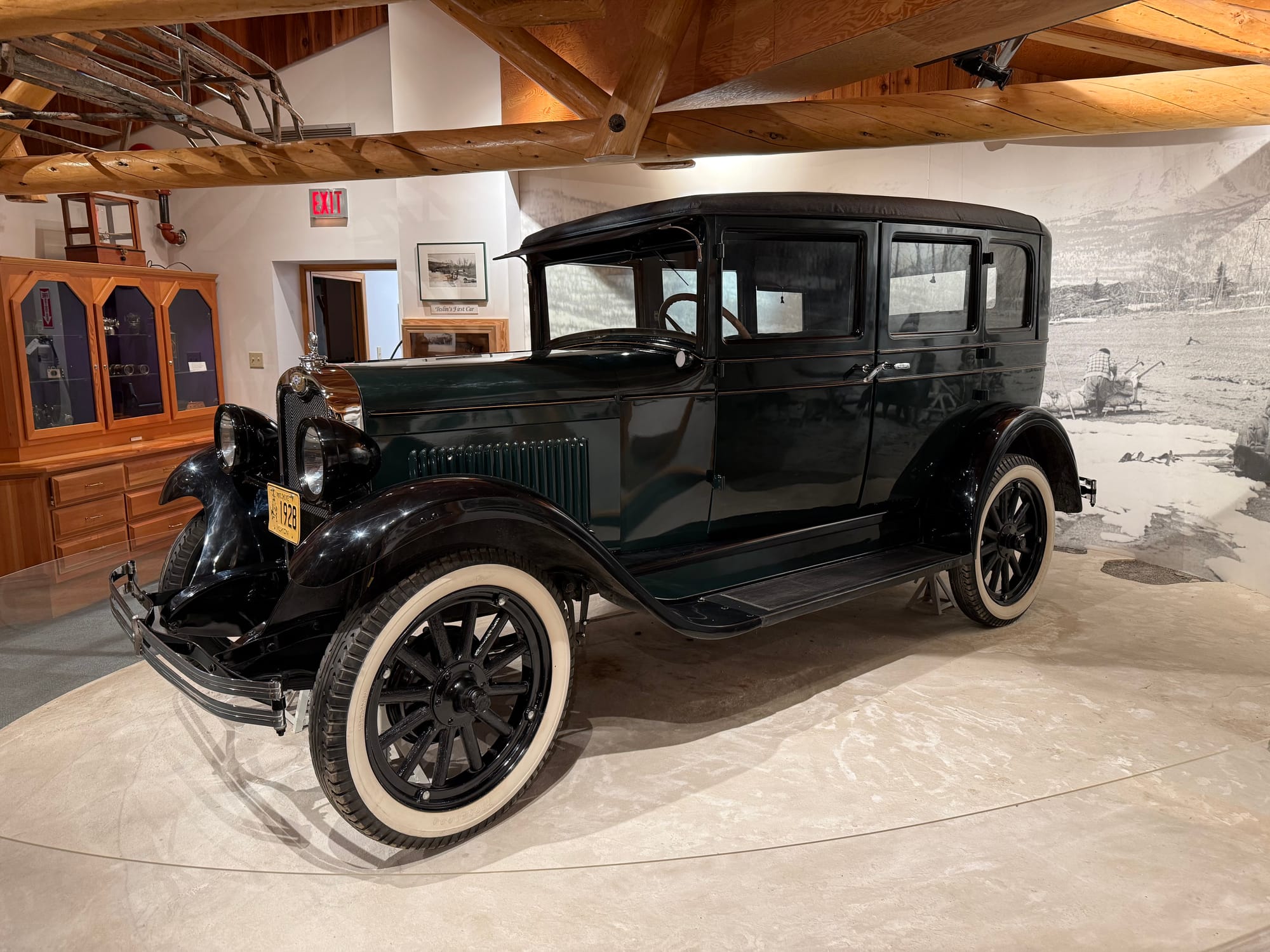 Another hour later, we reached the town of Teslin, a settlement of the Tlingit people. We visited the George Johnston Museum. The museum was small but the collection was meticulously curated. Better yet, the docent gave us a detailed history lesson about George Johnston, an Inland Tlingit man who was a real innovator in the community. First, he bought an early camera. He learned how to use it and develop his own pictures, despite that he didn’t read English at the time. He used the camera to document the life of the Inland Tlingit people, before they lost their traditional way-of-life. Later, he bought the first automobile in the town, even before there were roads or gas pumps! He used it to drive people across the frozen lake, and he painted it white for winter hunting expeditions. Finally, when the Alaska Highway was built, he opened an early store, selling refreshments and souvenirs to travelers. The museum was filled with his photos and artifacts from Tlingit life. And it had his old car, restored by the dealer who sold it to him! George Johnston seemed fascinating, and the museum was one of our favorite stops so far.