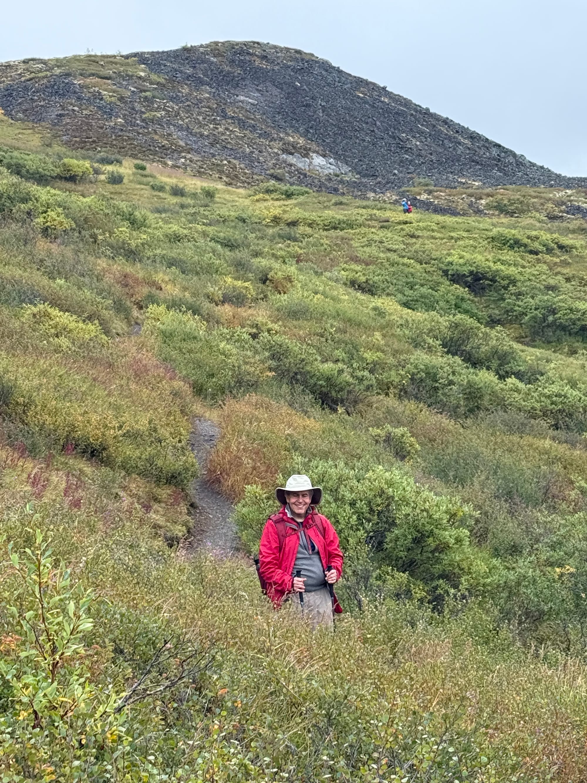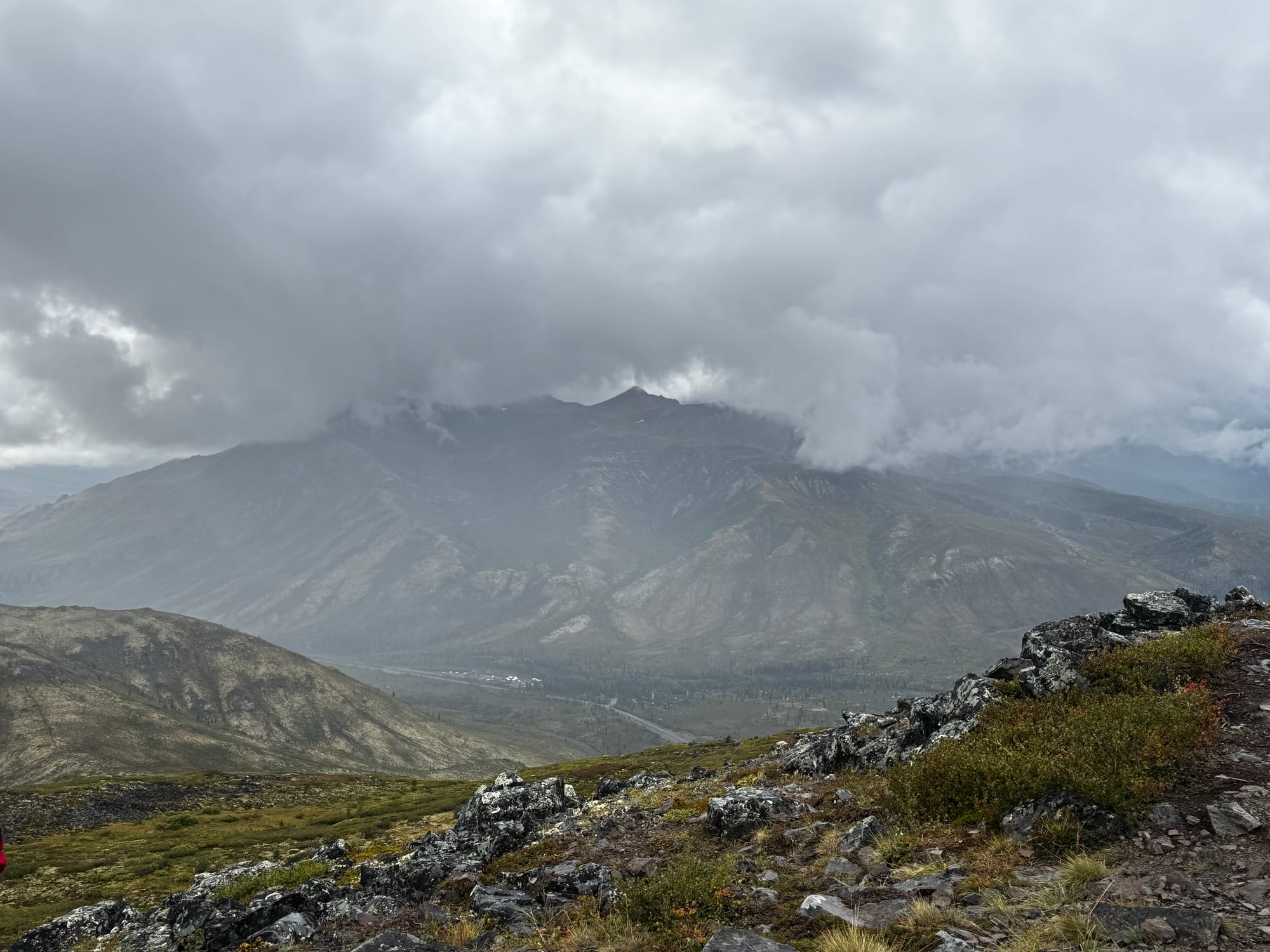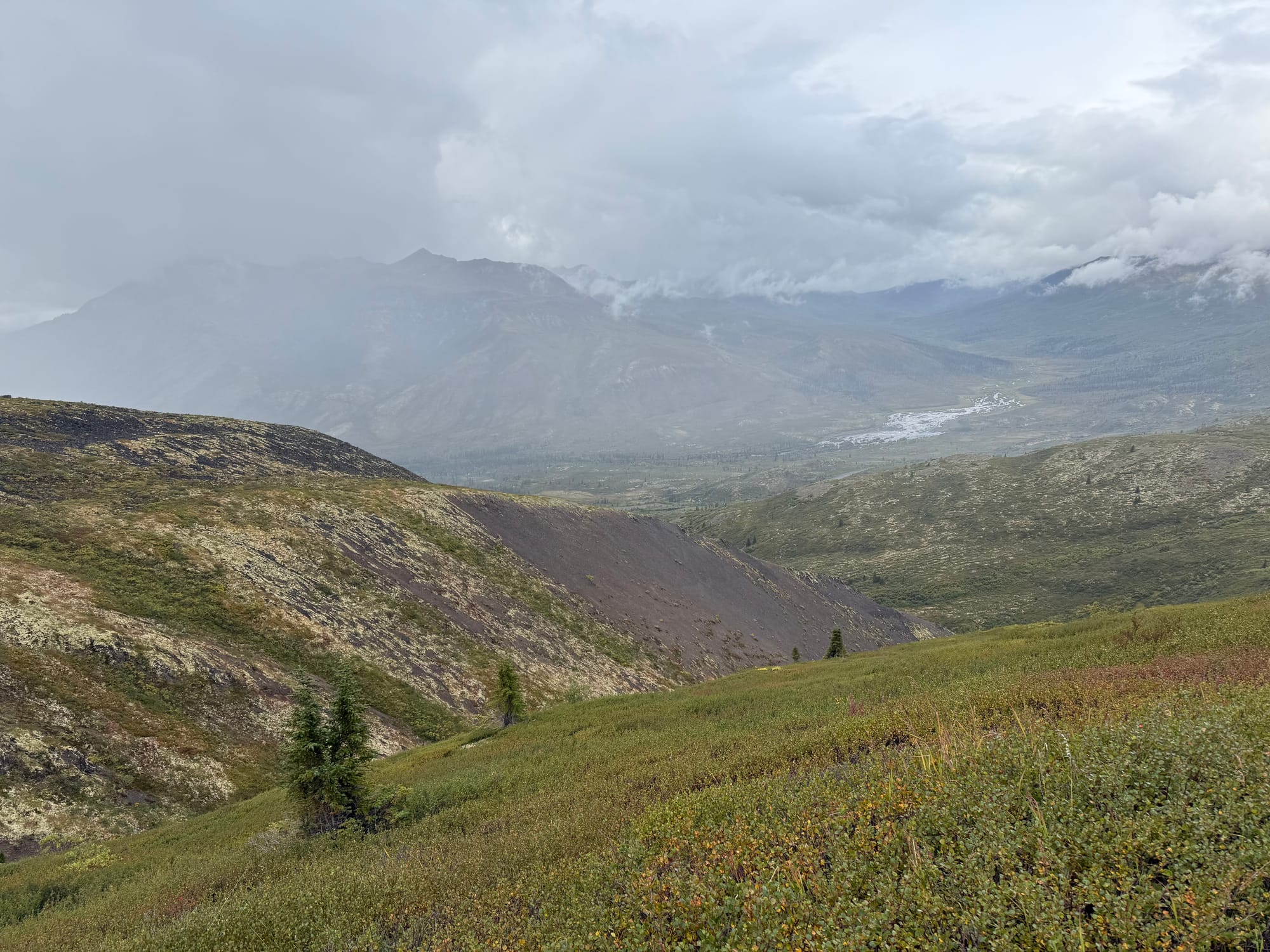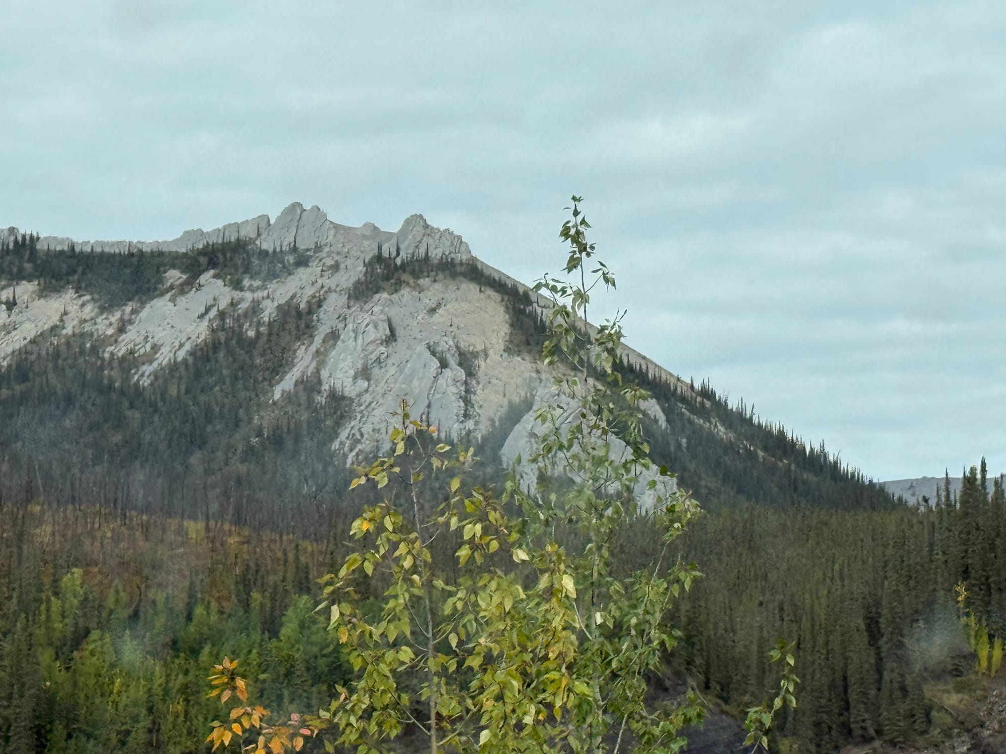 According to the Milepost, this area escaped glaciation during the ice age and gave refuge to unique flora and fauna. As a result, the mountains are more rounded than the mountains we have seen on this trip. The outcropping of rocks on the tops of the mountains are called tors.