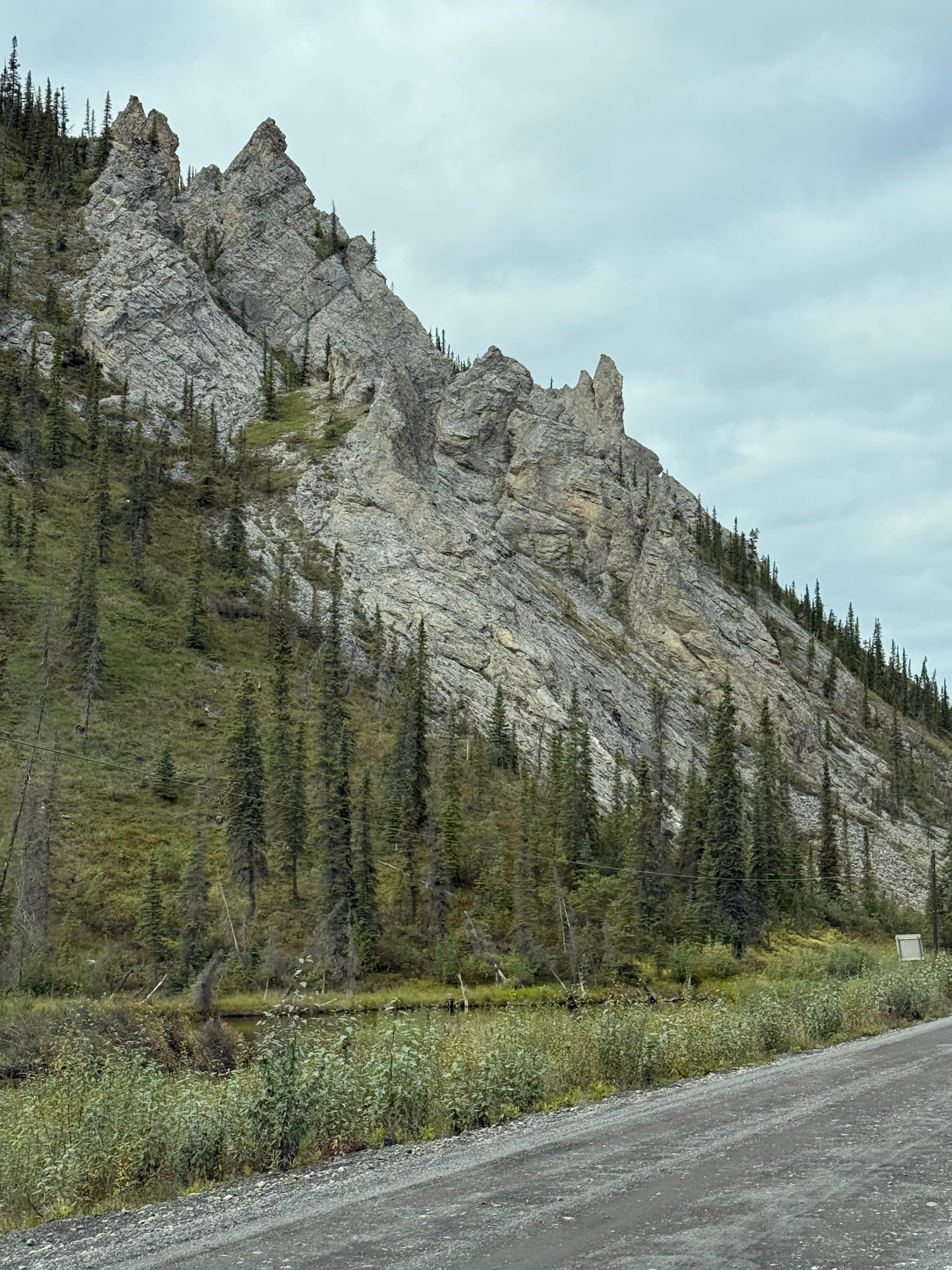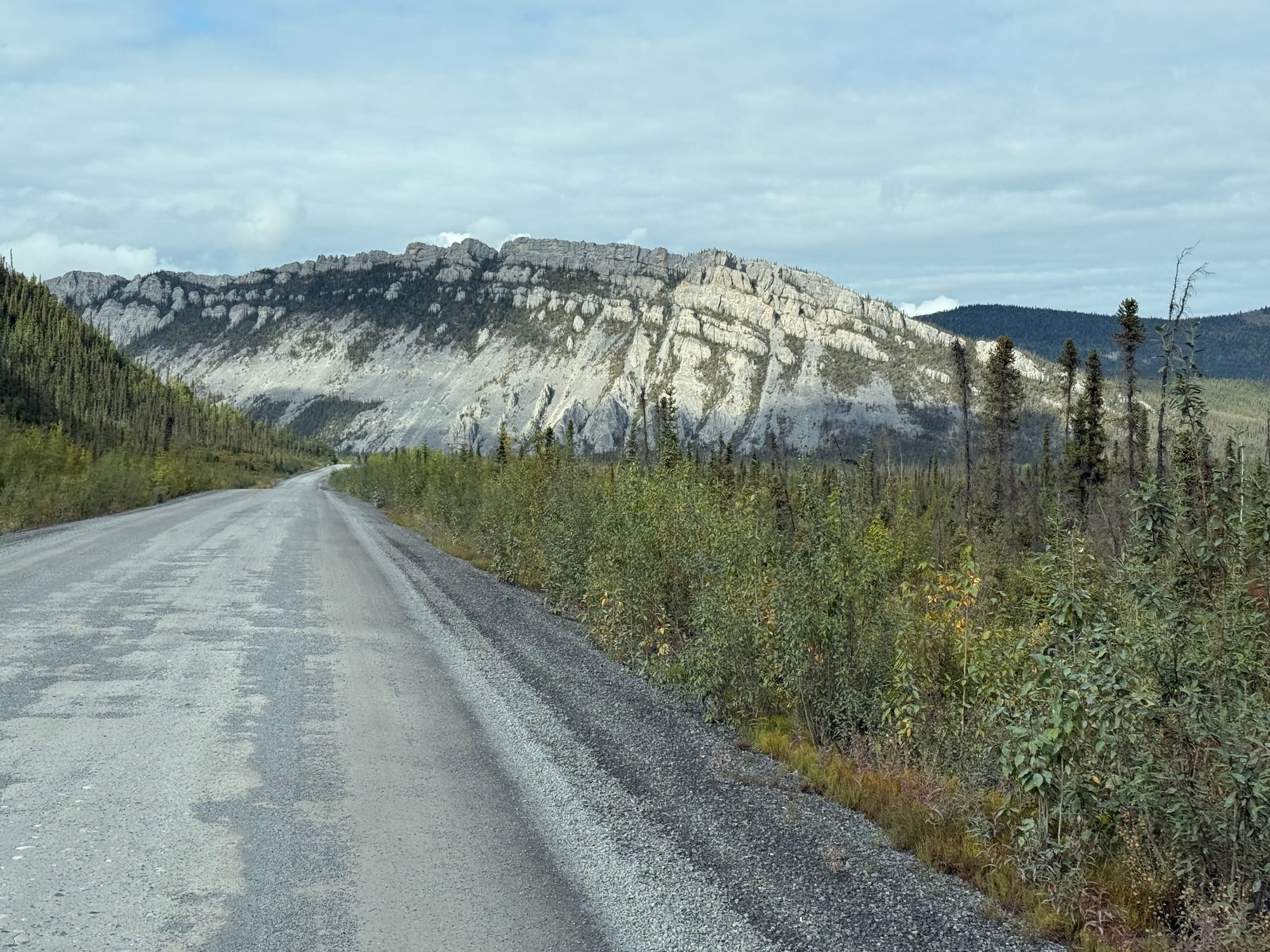 Today was a driving day. We drove almost 400 km (250 miles), mostly on the Dempster Highway heading North. At the RV park in Dawson earlier this week, we talked with a group that had just returned from the Dempster. We told them about how the road to Eagle was the worst road that we have driven. They laughed and said that we needed to try the Dempster because it’s worse. We don’t want jinx anything, but so far the Dempster has not been as bad as we were told. That isn’t to say that it’s good. It is about 750 km (500 miles) of unpaved, gravel road. We saw one vehicle flipped over the side of the road. We saw many vehicles struggling. However, we were warned so we were properly prepared, including the modifications we made to R2V2. We left Dawson with a full water tank and fuel tank. We have yet to reach the first fuel station, which is 370 km (230 miles) from the start. Services are very limited.