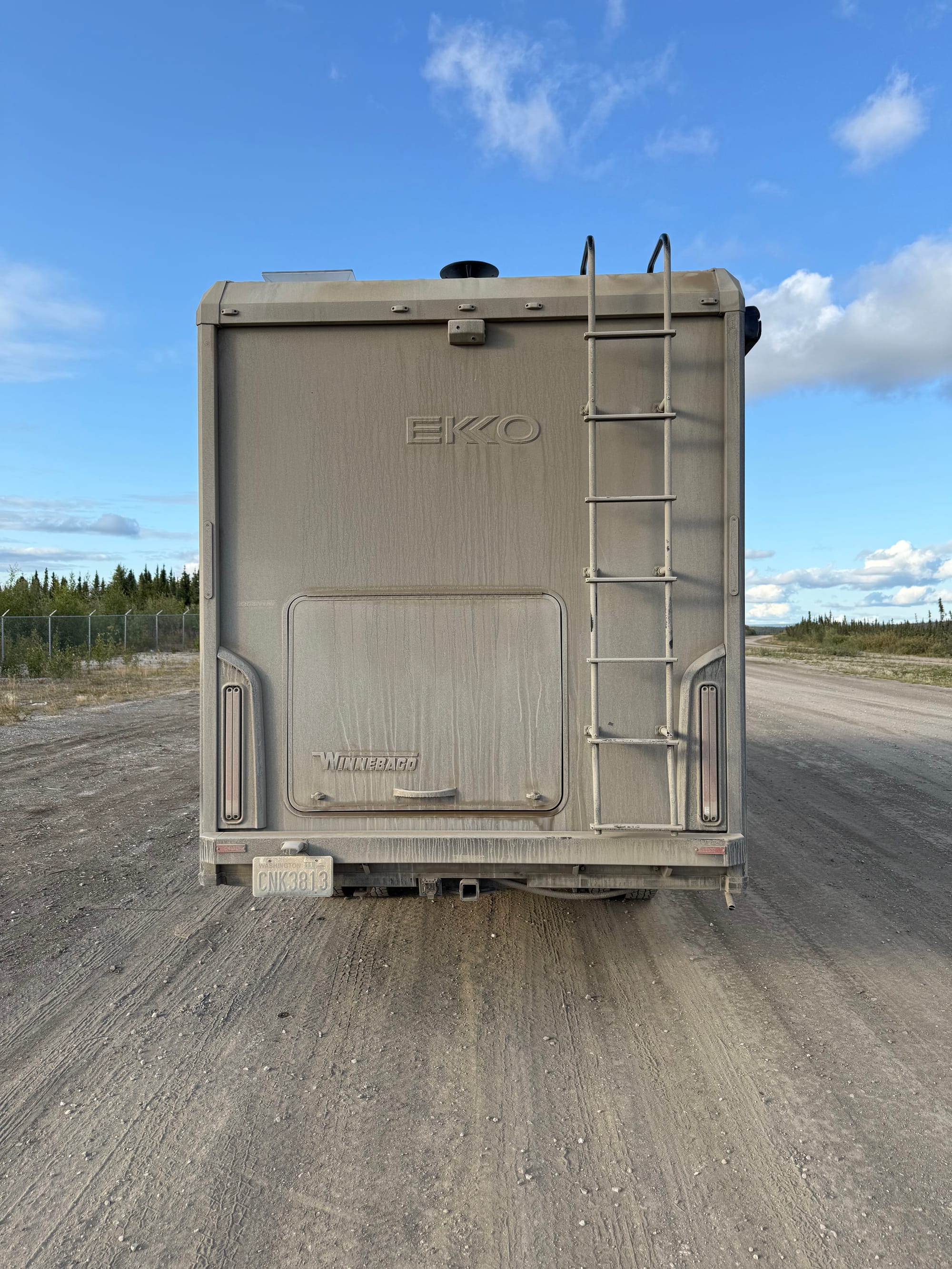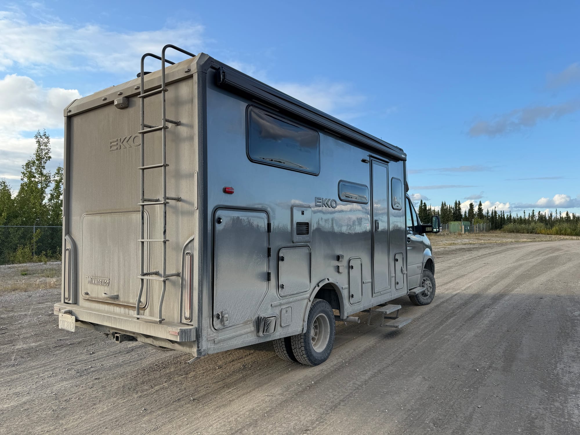 The road surface is covered with a layer of Calcium Chloride to reduce dust. This leaves a layer of dirt on all vehicles that travel along the road. R2V2 desperately needs a wash. So do the other vehicles on the Dempster.