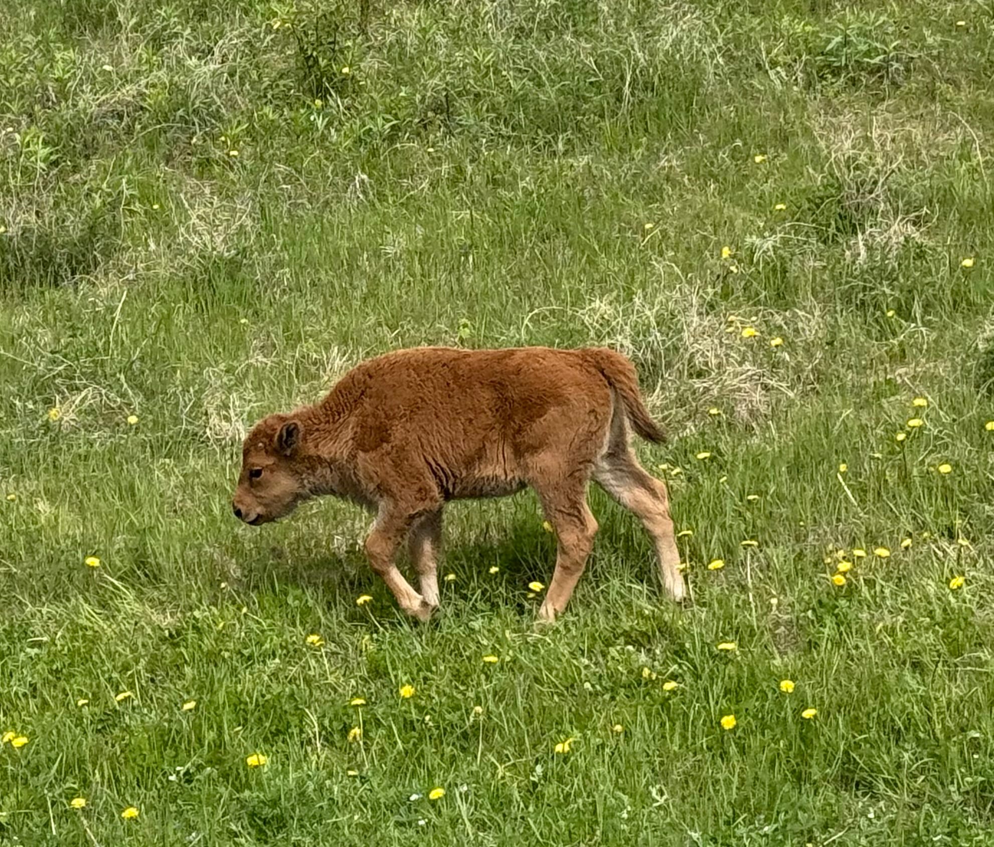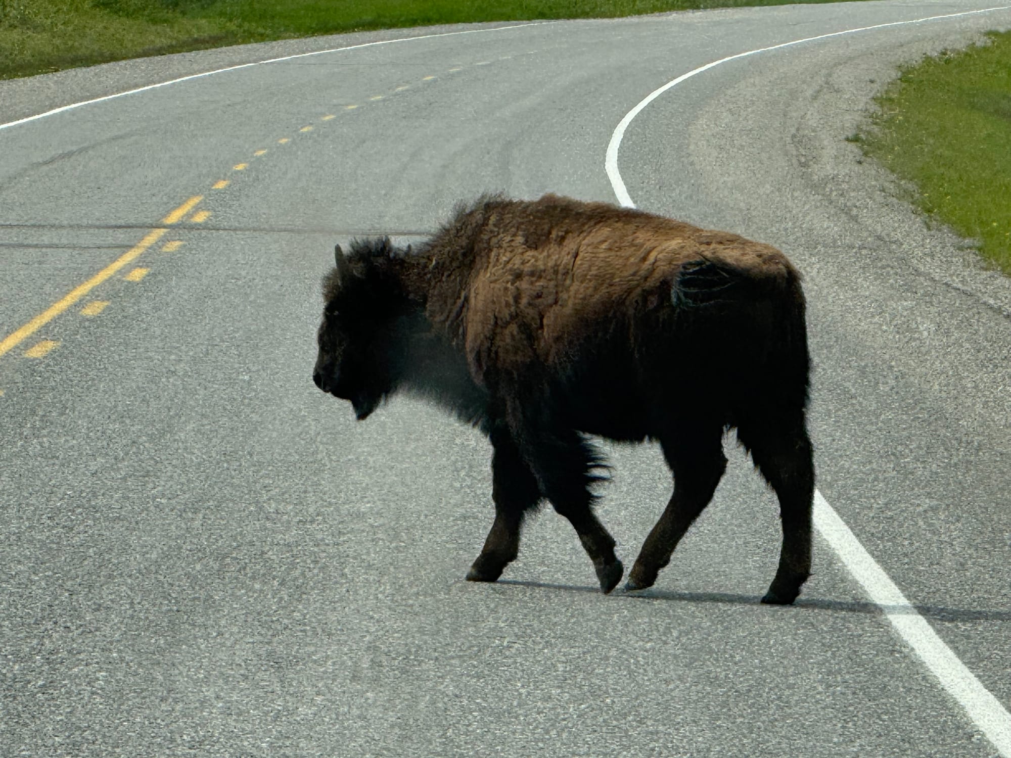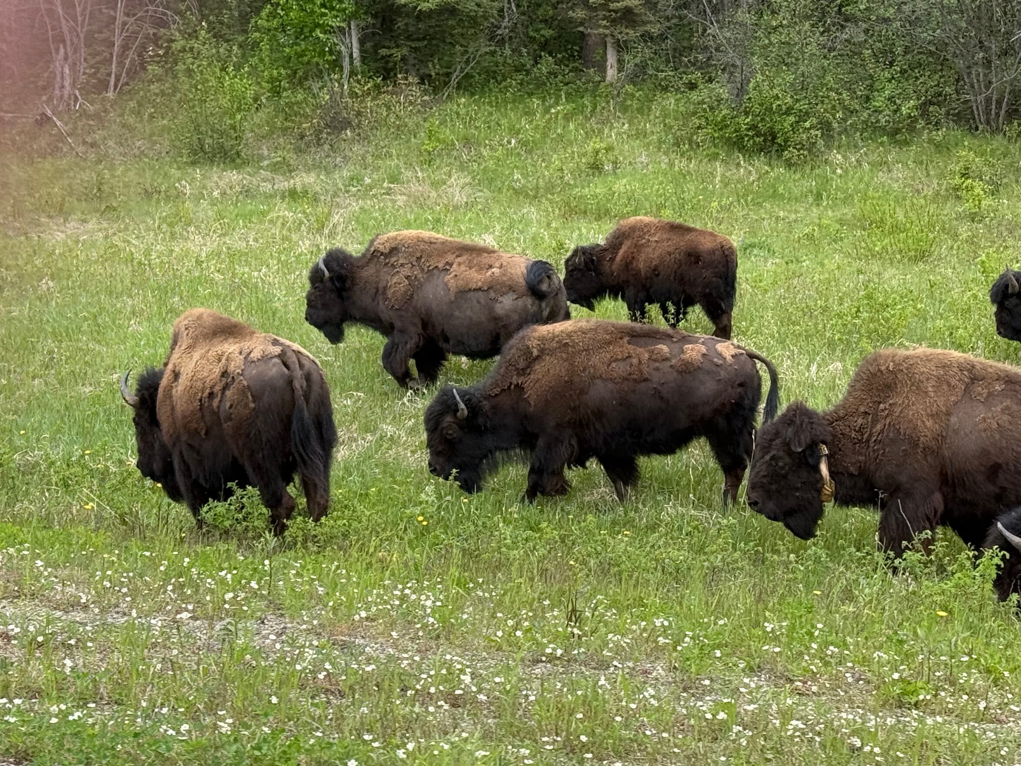 Now, the signs and our Milepost guidebook have promised wildlife, but we didn't see much until today. Today, we saw moose, deer and bison. No bears, so our bear count remains at 3. But so much bison. Herd after herd after herd of bison. The bison amble along the fields, across the road, wherever they want to go. Unlike Yellowstone, the speed limit on the Alaska Highway is generally 100 km/h (about 60 mph). So you have to be vigilant for wildlife, especially the bison. We also saw dozens of baby bison, who look absolutely adorable. Hard to believe that anyone would not slow down for a long look, though we saw one commercial truck just speed on past. We followed the local custom to turn on your flashing hazard lights when slowing down for wildlife.
