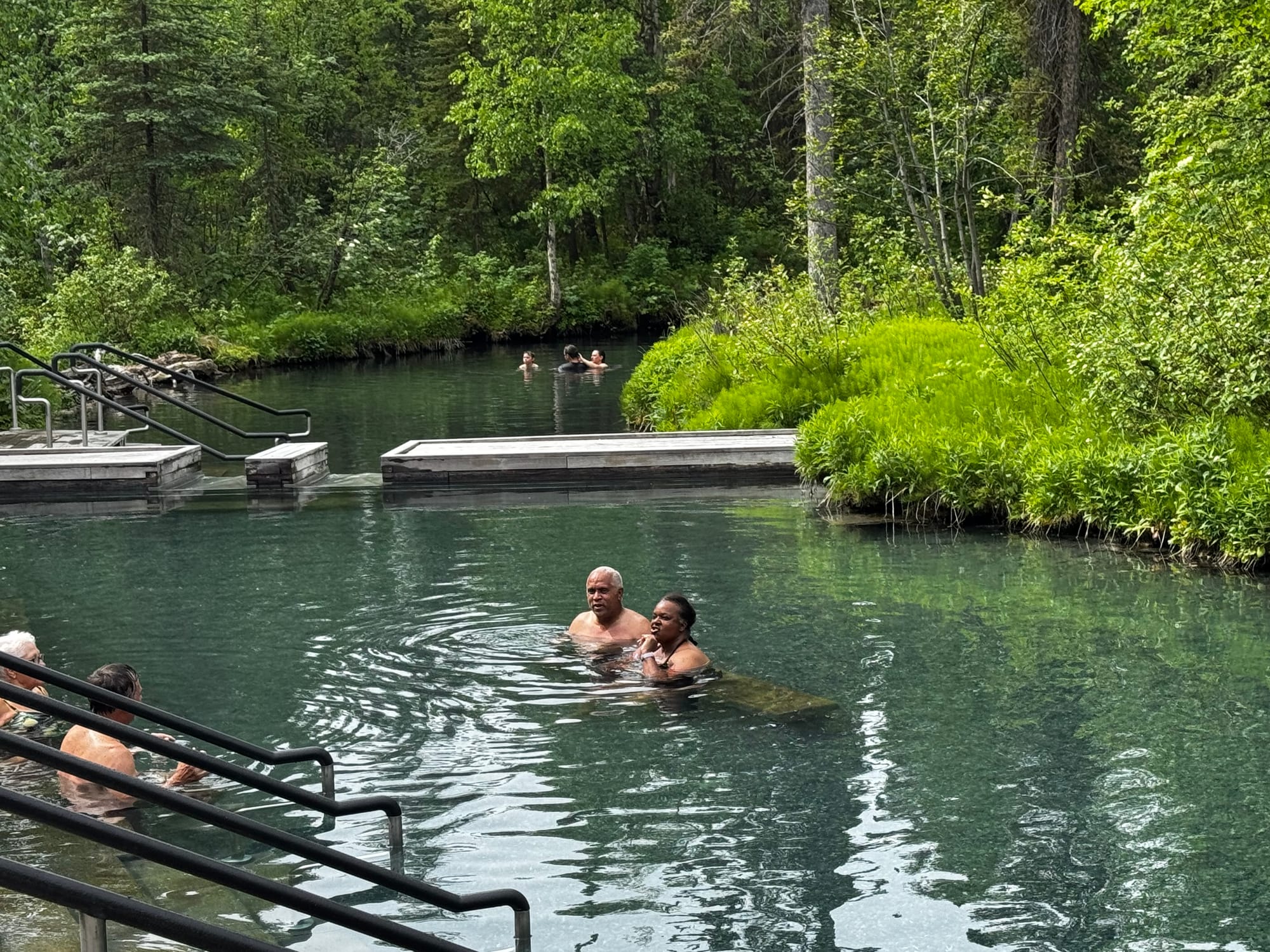 There were around 20-30 people total in the hot springs, so it did not feel crowded at all. We bumped into several people who were in the same campground the night before, and we chatted about the trip, both past and future. When we said we went kayaking in Muncho Lake that morning, they said, "Wait, that was you? We saw you - you had the lake to yourselves!" We spent around 90 minutes relaxing in the different pools, then we returned to the RV to clean up and continue along the Alaska Highway.