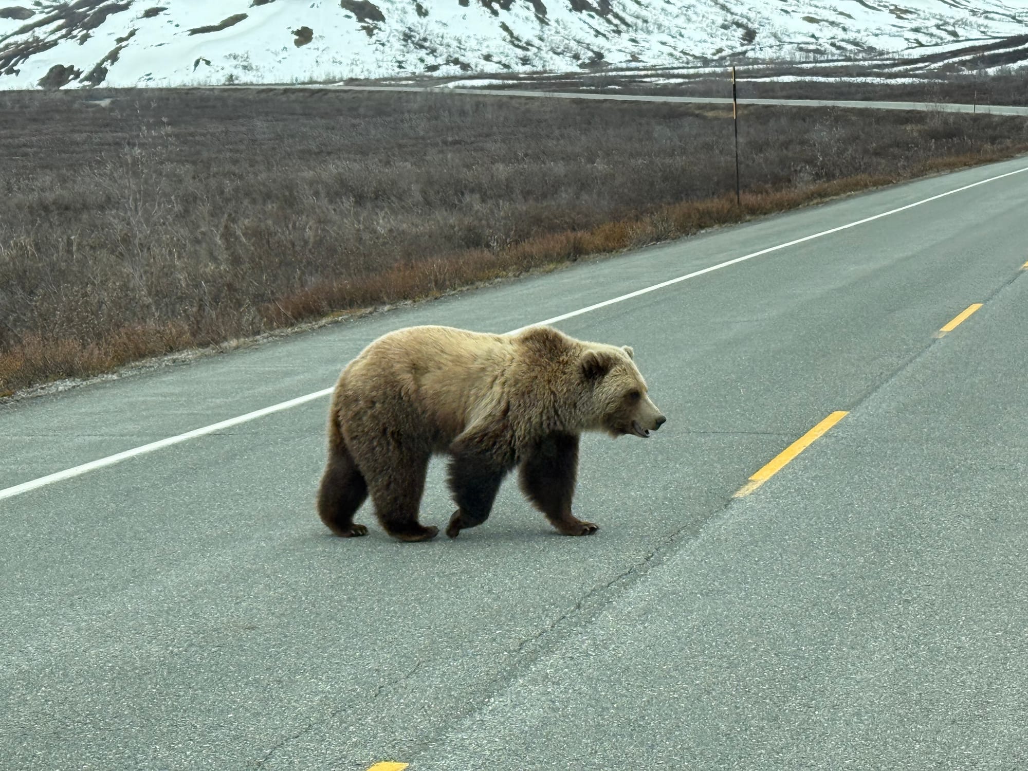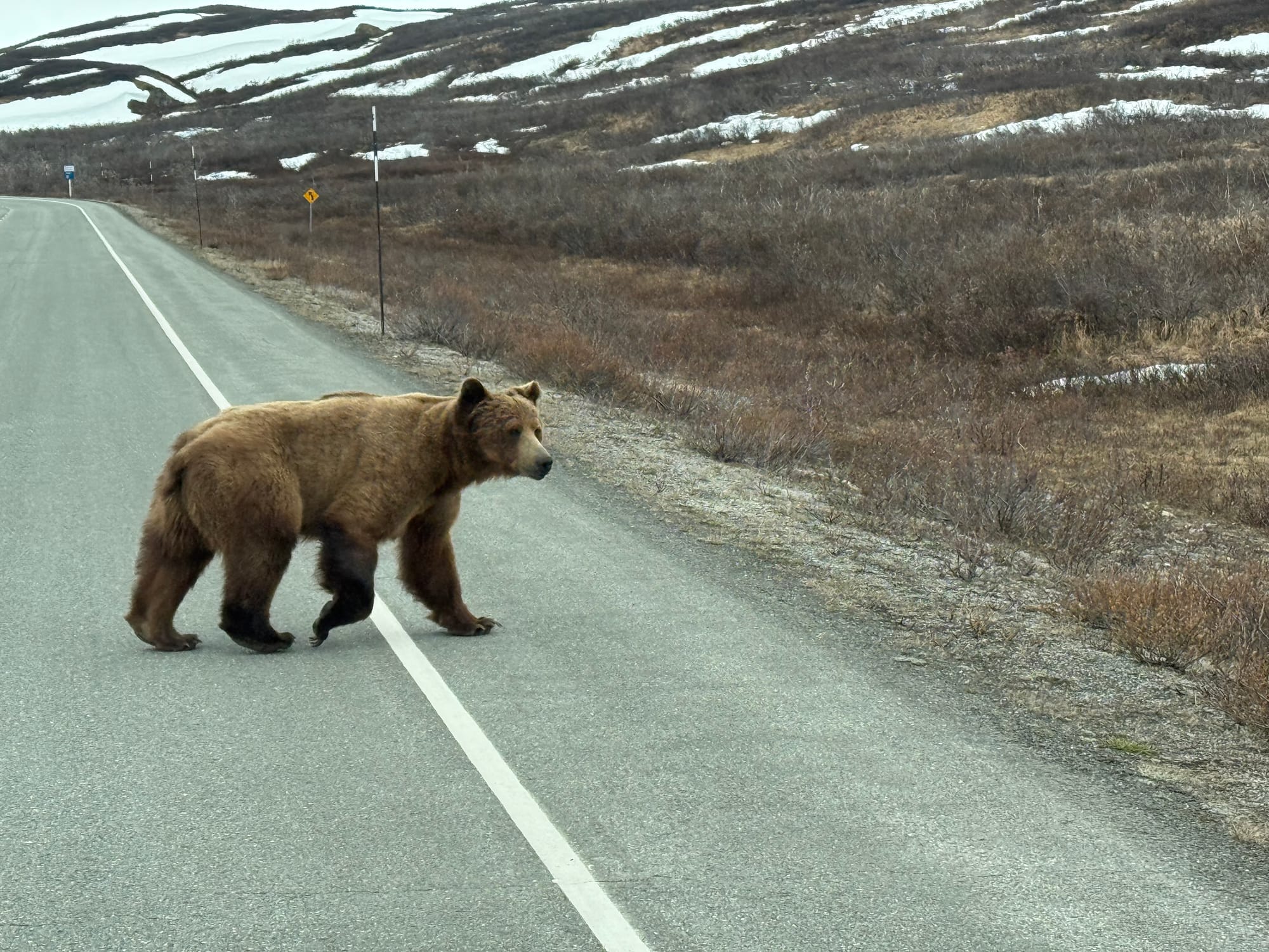 Right before we reached the summit on the road towards the US, two grizzly bears crossed right in front of our vehicle. Amy shouted “Bear! Bear!”, so Greg slammed the brakes to avoid hitting the first one. Luckily there was little traffic, but our stuffed animal mascot Buc-Ee got thrown around the RV. We stopped to let the bears pass.